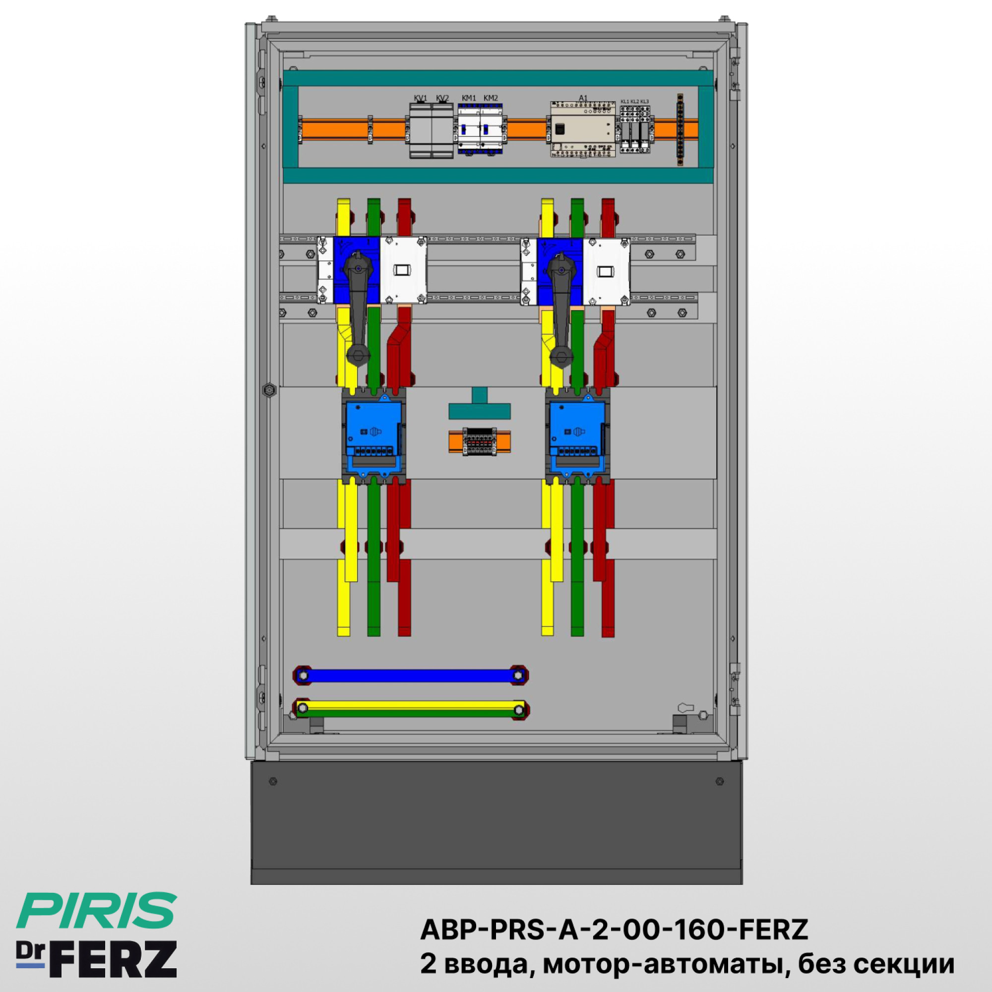 АВР-PRS-А-2-00-160-FERZ оснащен системой автоматического ввода резерва. Управление осуществляется выключателем‑разъединителем Dr.Ferz в литом корпусе FPC-21-N-250-TM-D 160А 50kA с рег. термомаг. расцепителем с моторными приводами. Ресурс выходных реле контроллера — до 100 000 коммутационных циклов при номинальной нагрузке (AC-1), что обеспечивает длительную и стабильную работу.