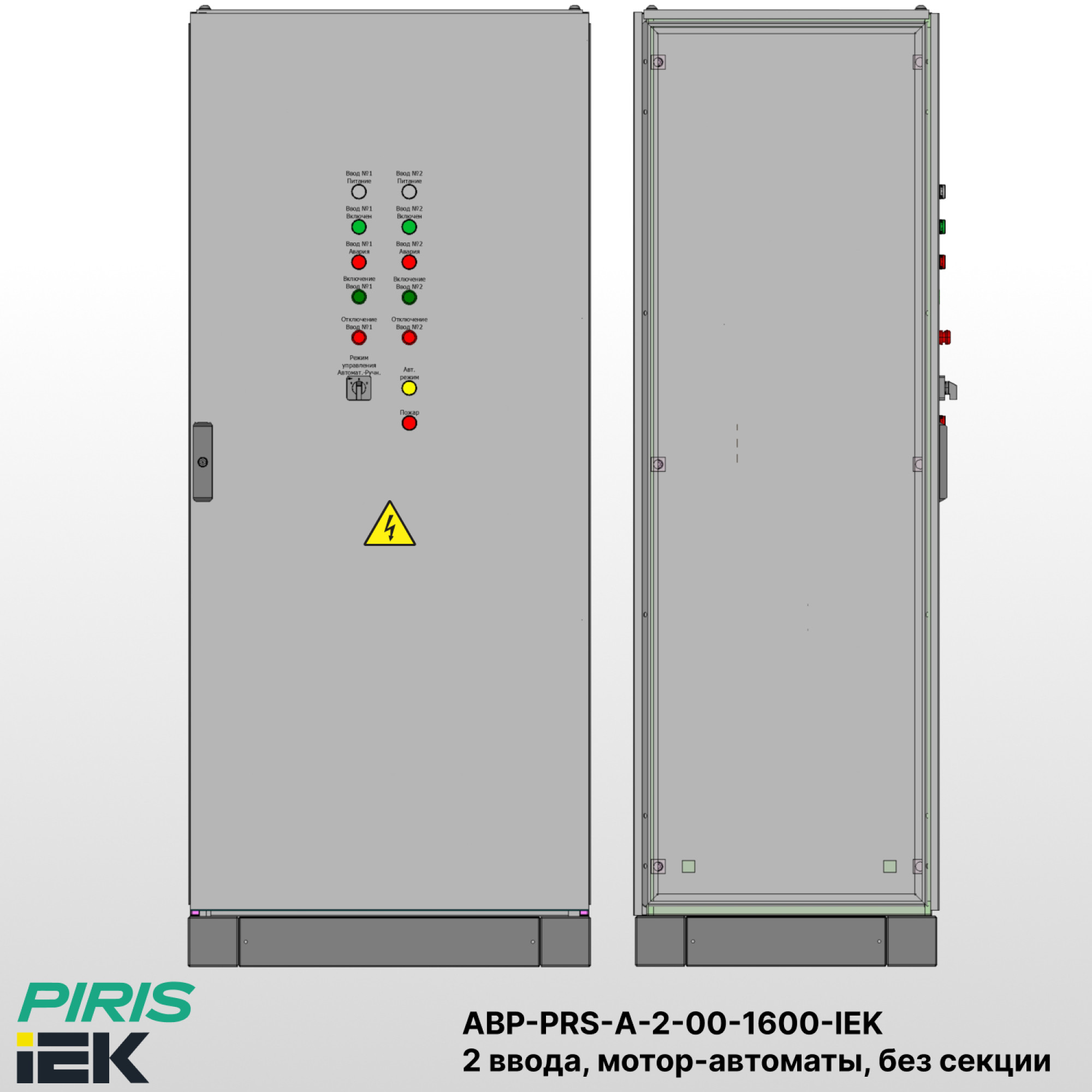 Шкаф автоматического ввода резерва — АВР-PRS-А-2-00-1600-IEK напольного исполнения, из цельносварного корпуса в габаритах 1800×800×600 со степенью защиты IP31, предназначен для автоматического переключения питания между основным и резервным вводами для электроприёмников 1-й категории, когда перерыв в электроснабжении недопустим.