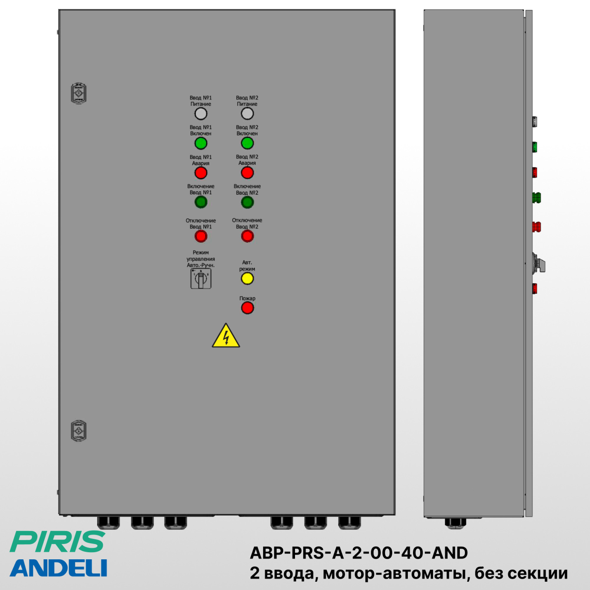 АВР-PRS-А-2-00-40-AND оснащен системой автоматического ввода резерва. Управление осуществляется автоматическими выключателями в литом корпусе Andeli 40А с моторными приводами. Ресурс выходных реле контроллера — до 100 000 коммутационных циклов при номинальной нагрузке (AC-1), что обеспечивает длительную и стабильную работу.