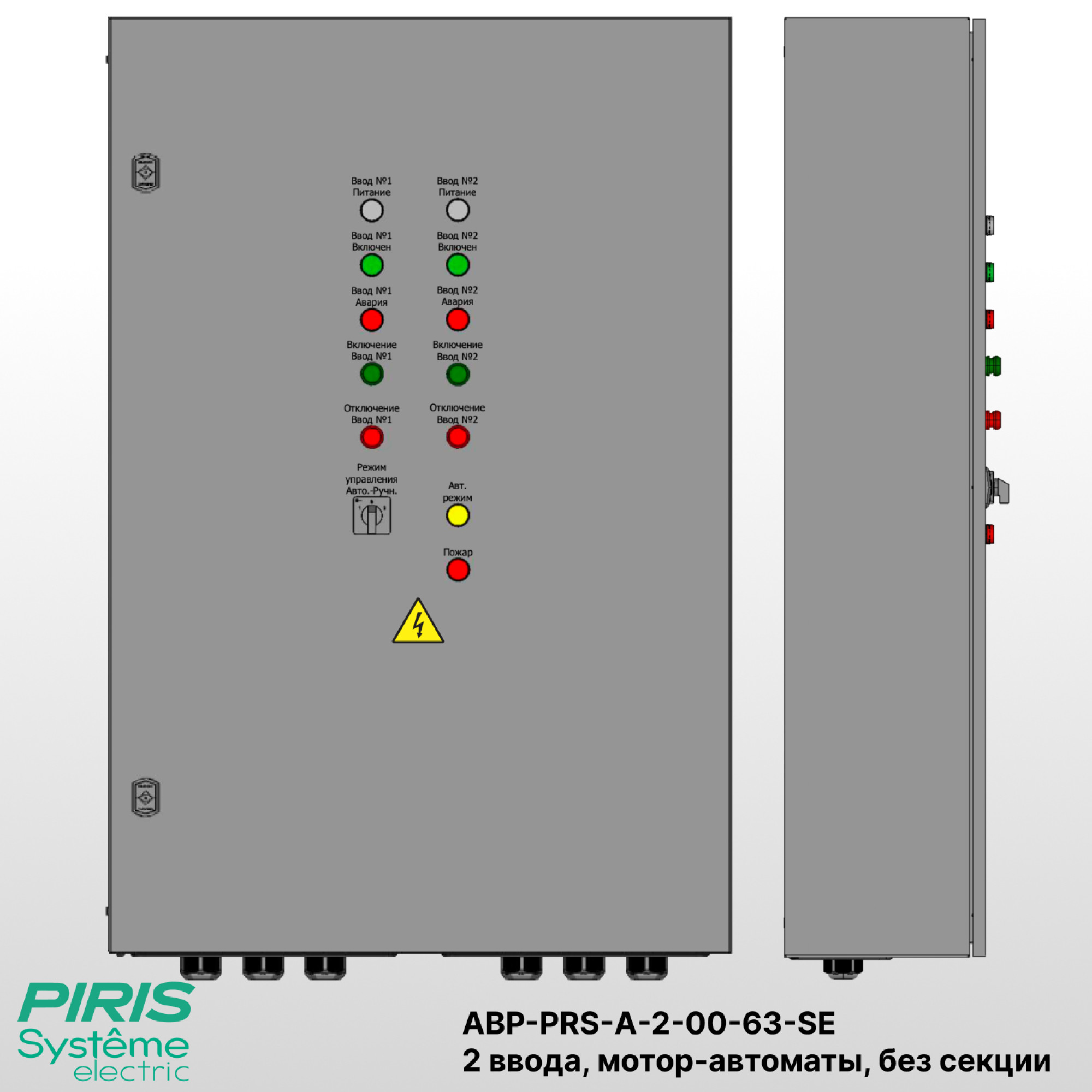 АВР-PRS-А-2-00-63-SE оснащен системой автоматического ввода резерва. Управление осуществляется автоматическими выключателями в литом корпусе Systeme Electric 63А с моторными приводами. Ресурс выходных реле контроллера — до 100 000 коммутационных циклов при номинальной нагрузке (AC-1), что обеспечивает длительную и стабильную работу.