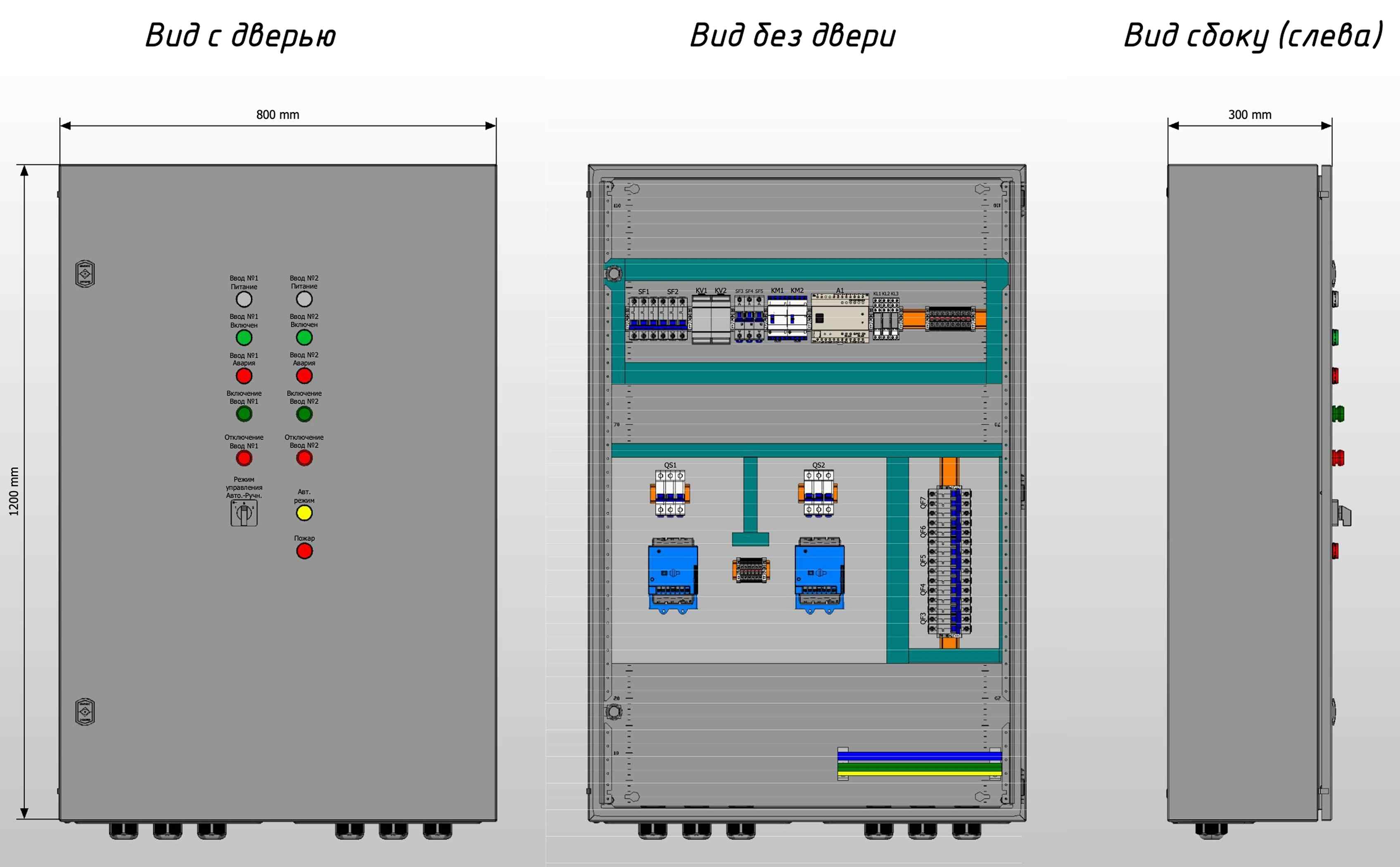 На двери шкафа размещены органы управления и индикации: переключатель режима Автоматический / Ручной, кнопки включения и отключения каждого ввода, а также световая сигнализация состояния системы: наличие питания на вводах, авария, включение ввода, автоматический режим и сигнал «Пожар».