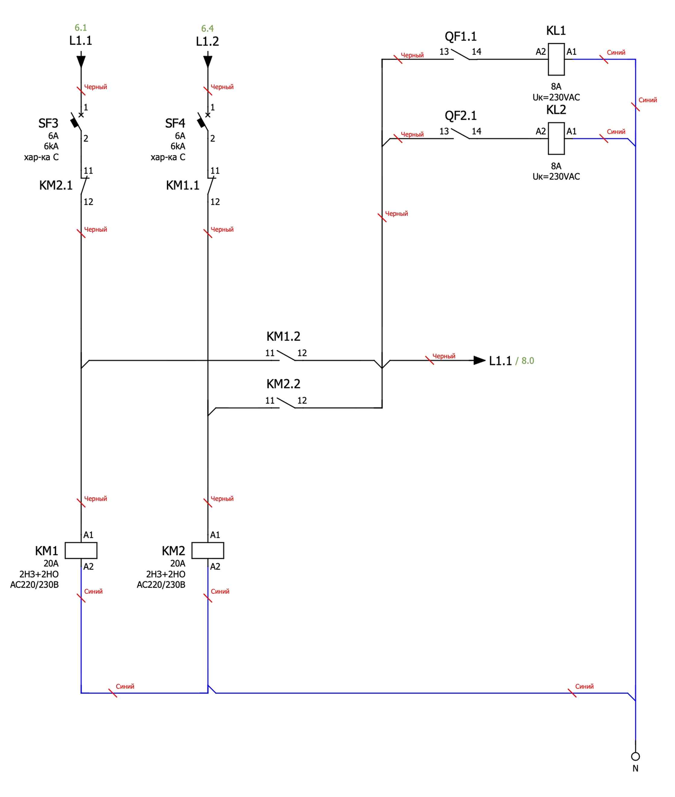 Контроль наличия и качества напряжения на каждом вводе осуществляется через реле напряжения РН-111М-УХЛ3.1. Для питания цепей управления предусмотрена отдельная схема мини-АВР, обеспечивающая резервирование питания управляющей части шкафа.