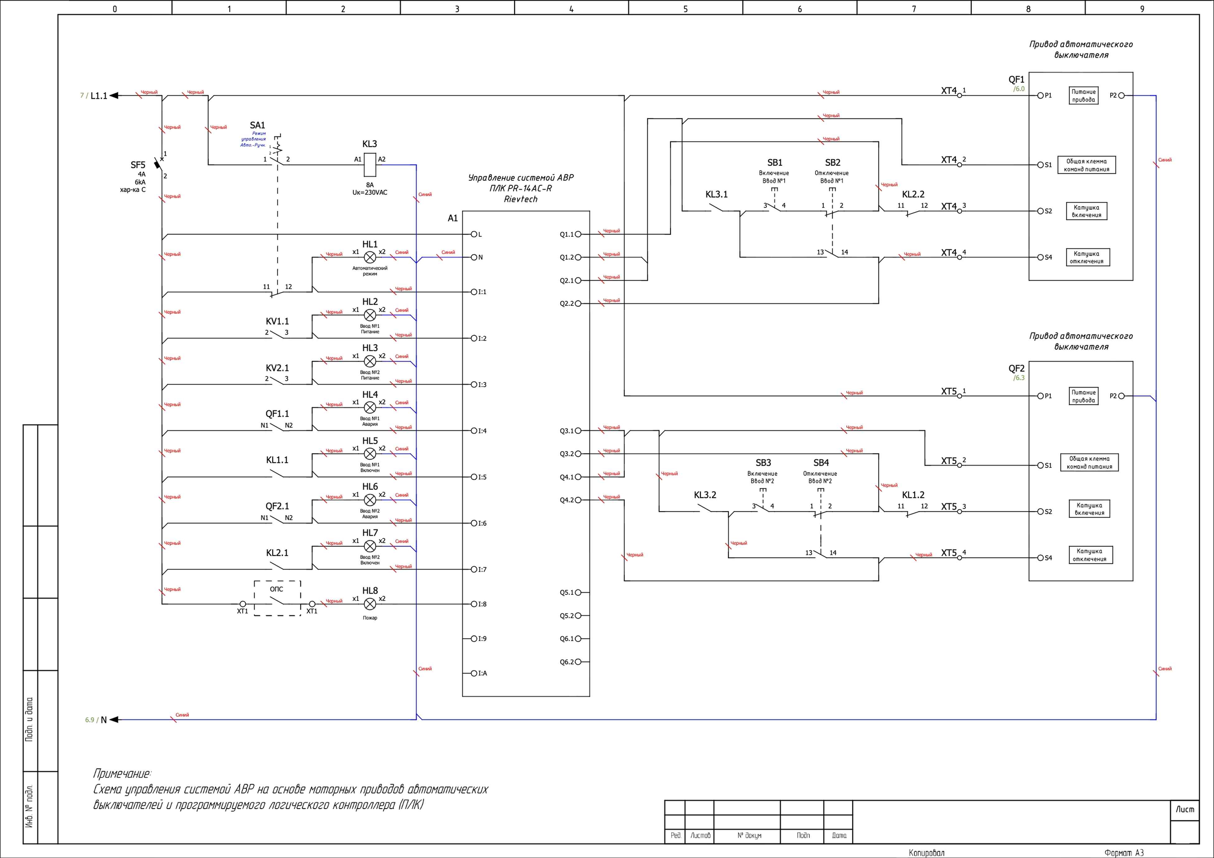 Управление выполнено на базе ПЛК Rievtech PR-14AC-R. Контроллер обрабатывает сигналы состояния вводов, управляет моторными приводами вводных автоматов, реализует автоматический и ручной режимы работы, временные задержки переключения, световую индикацию и блокировку одновременного включения двух вводов.