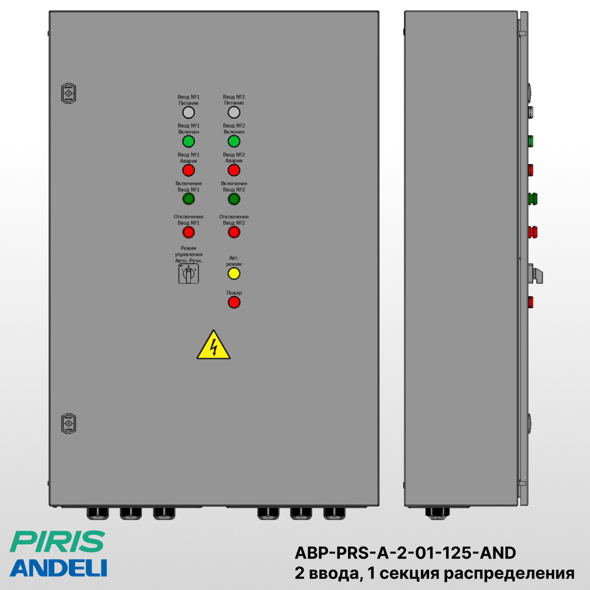 На дверце шкафа установлена панель управления с индикацией состояния вводов и секции, а также переключателями режимов работы (ручной / автоматический). Для удобства эксплуатации предусмотрен доступ к клеммам управления и силовым аппаратам.