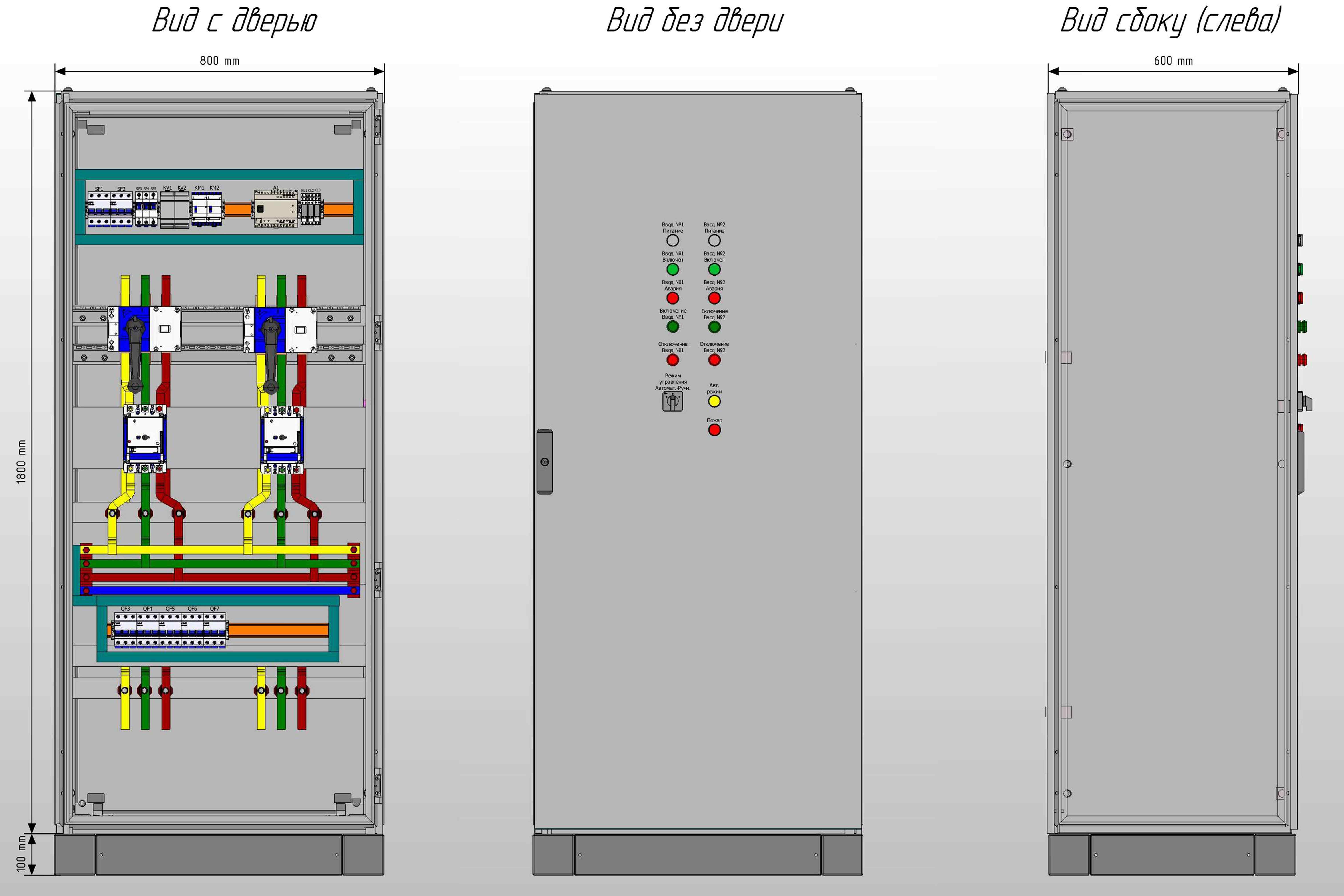 На двери шкафа размещены органы управления и индикации: переключатель режима Автоматический / Ручной, кнопки включения и отключения каждого ввода, а также световая сигнализация состояния системы: наличие питания на вводах, авария, включение ввода, автоматический режим и сигнал «Пожар».