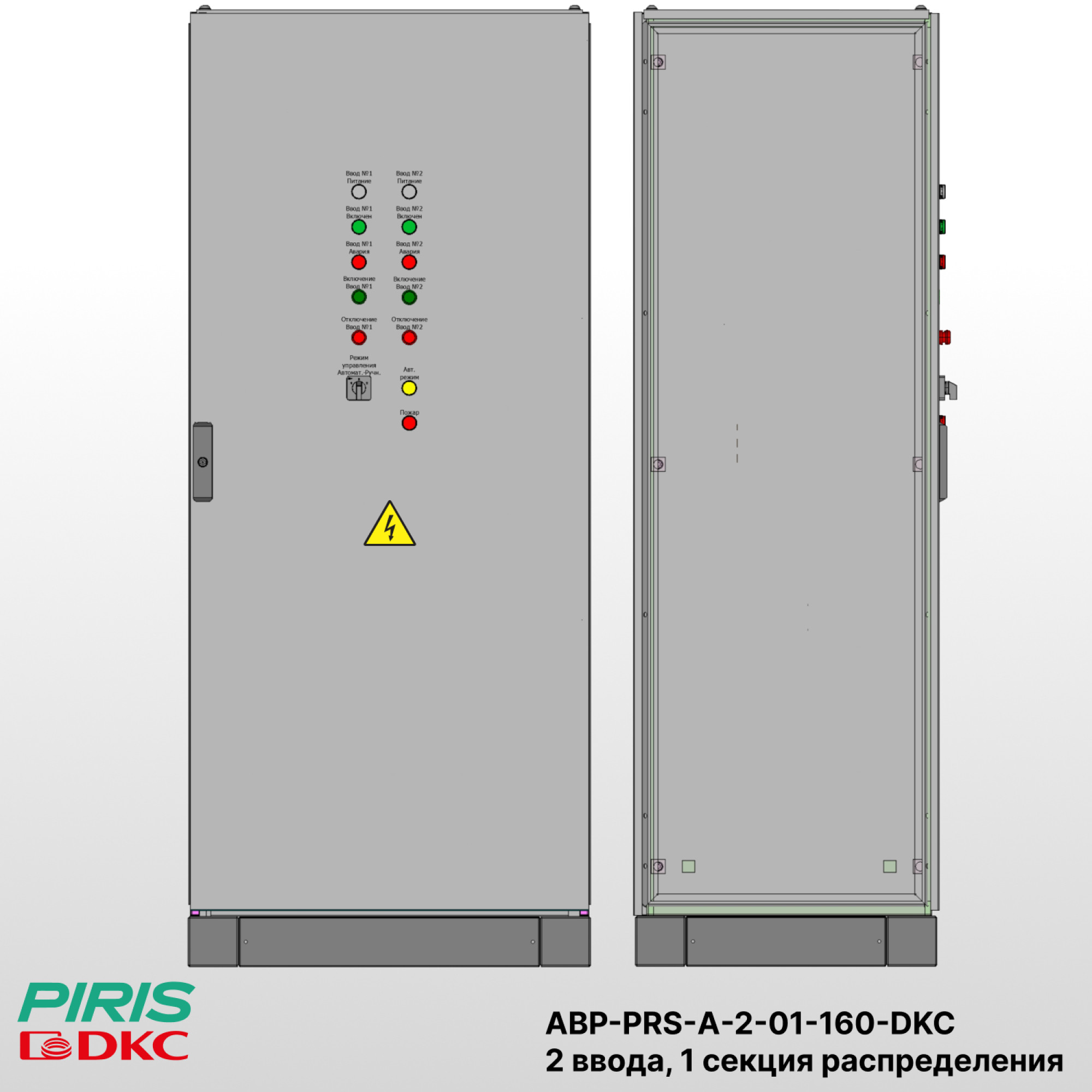 На дверце шкафа установлена панель управления с индикацией состояния вводов и секции, а также переключателями режимов работы (ручной / автоматический). Для удобства эксплуатации предусмотрен доступ к клеммам управления и силовым аппаратам.