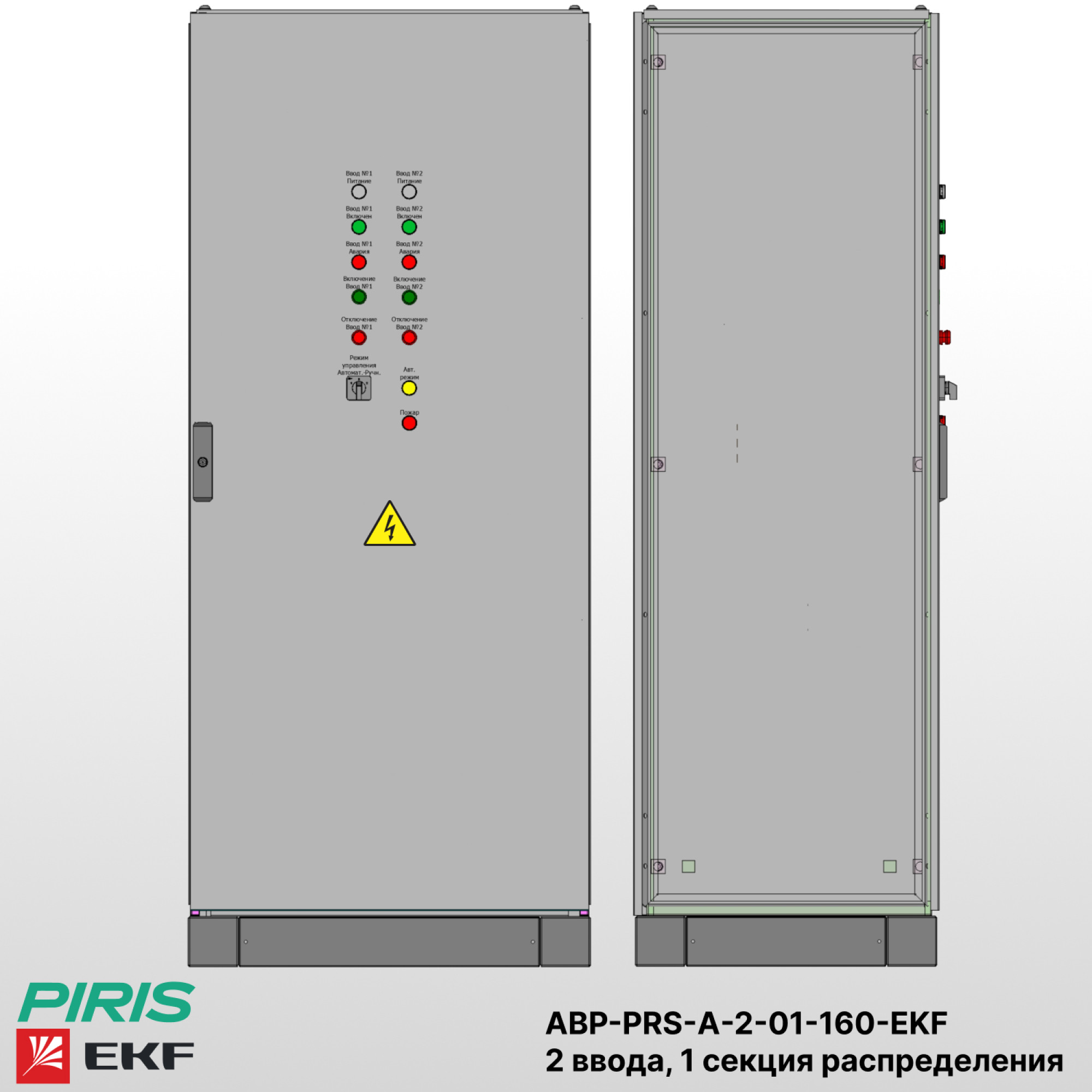 На дверце шкафа установлена панель управления с индикацией состояния вводов и секции, а также переключателями режимов работы (ручной / автоматический). Для удобства эксплуатации предусмотрен доступ к клеммам управления и силовым аппаратам.