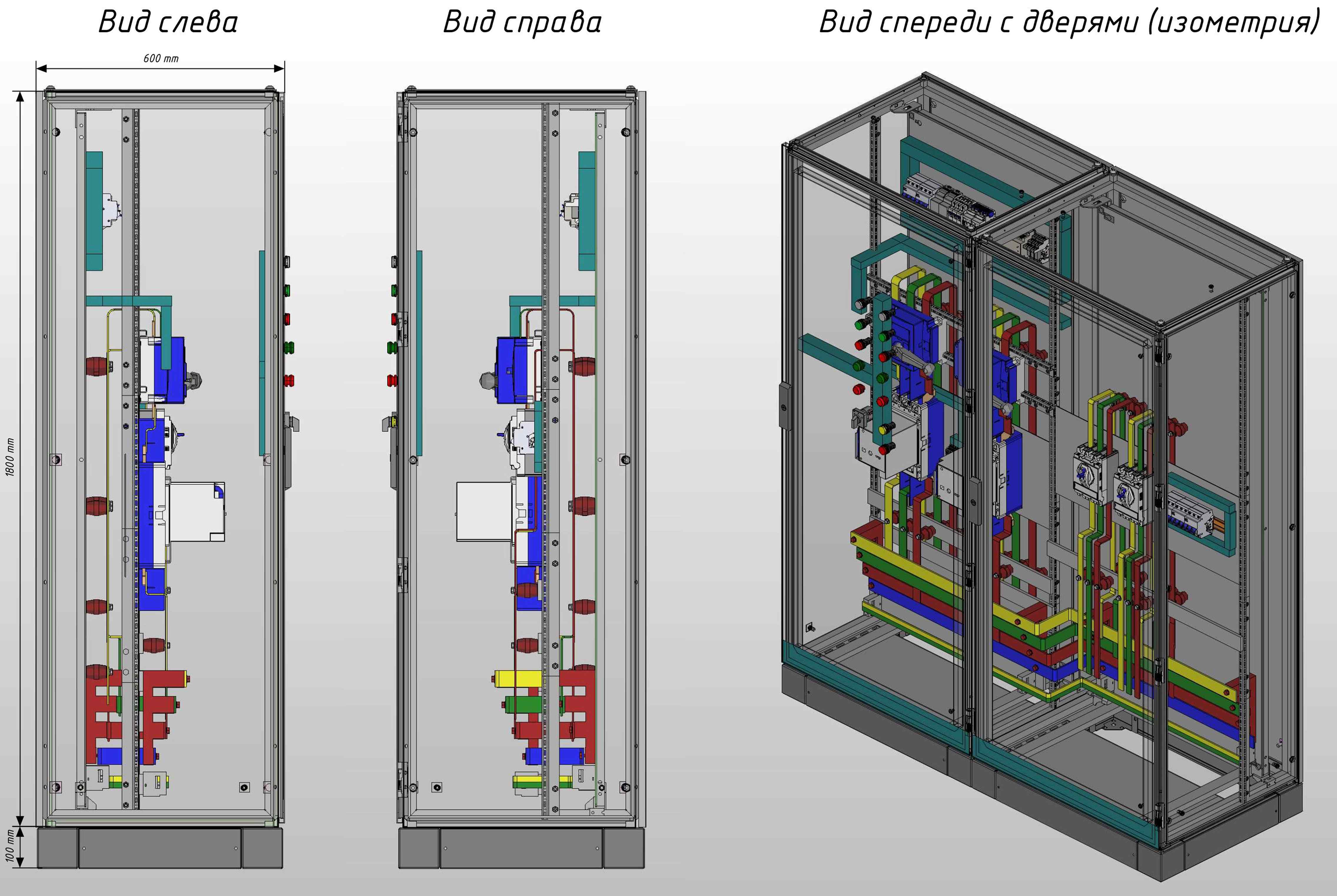 Изделие выполнено в напольном исполнении на базе двух корпусов с общими габаритами 1800×1600×600 мм и цоколем 100 мм. Стандартная степень защиты шкафа — IP31, цвет корпуса — RAL 7035. Базово предусмотрен ввод и вывод кабелей снизу.
