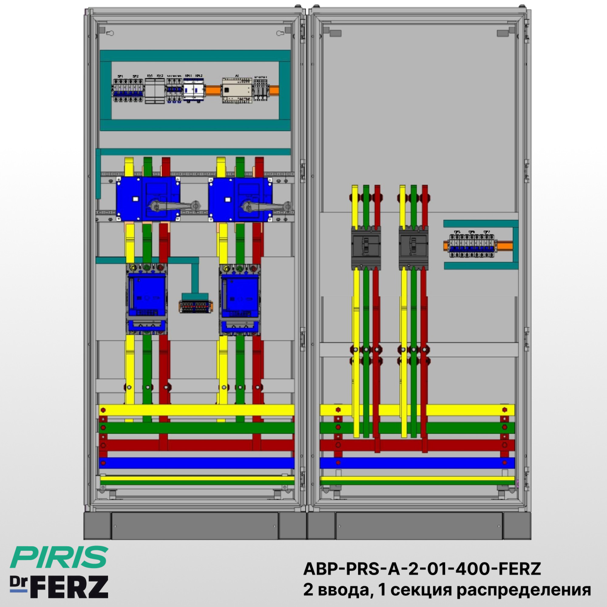 Шкаф автоматического ввода резерва АВР-PRS-А-2-01-400-FERZ — напольное низковольтное комплектное устройство на 2 ввода с 1 секцией распределения, предназначенное для автоматического переключения питания на резервный ввод при исчезновении напряжения или выходе параметров сети за допустимые пределы на основном вводе. После восстановления нормального электроснабжения шкаф автоматически возвращает питание на основной ввод.