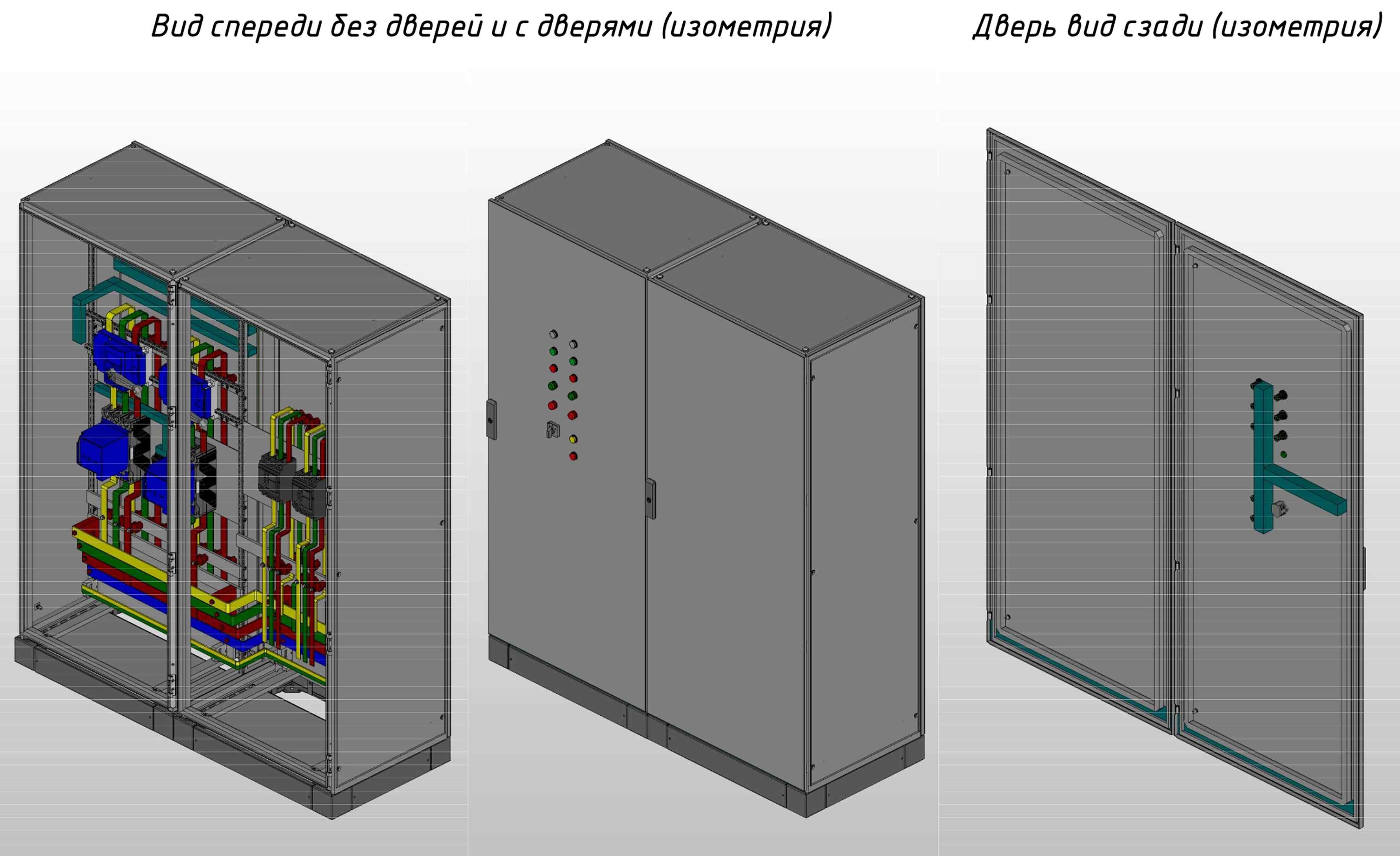 Изделие выполнено в напольном исполнении на базе двух корпусов с общими габаритами 1800×1600×600 мм и цоколем 100 мм. Стандартная степень защиты шкафа — IP31, цвет корпуса — RAL 7035. Базово предусмотрен ввод и вывод кабелей снизу.