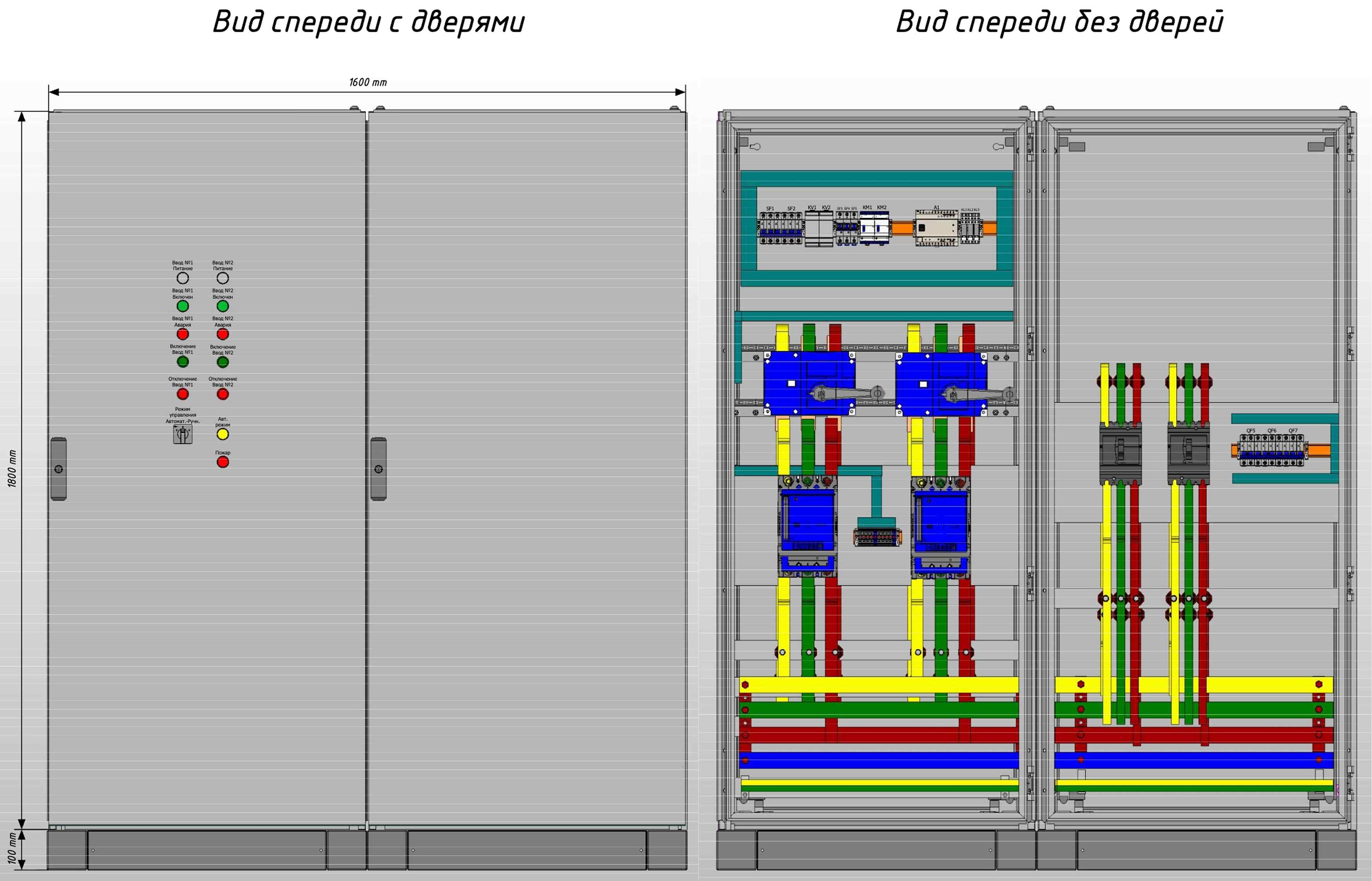 На двери шкафа размещены органы управления и индикации: переключатель режима Автоматический / Ручной, кнопки включения и отключения каждого ввода, а также световая сигнализация состояния системы: наличие питания на вводах, авария, включение ввода, автоматический режим и сигнал «Пожар».