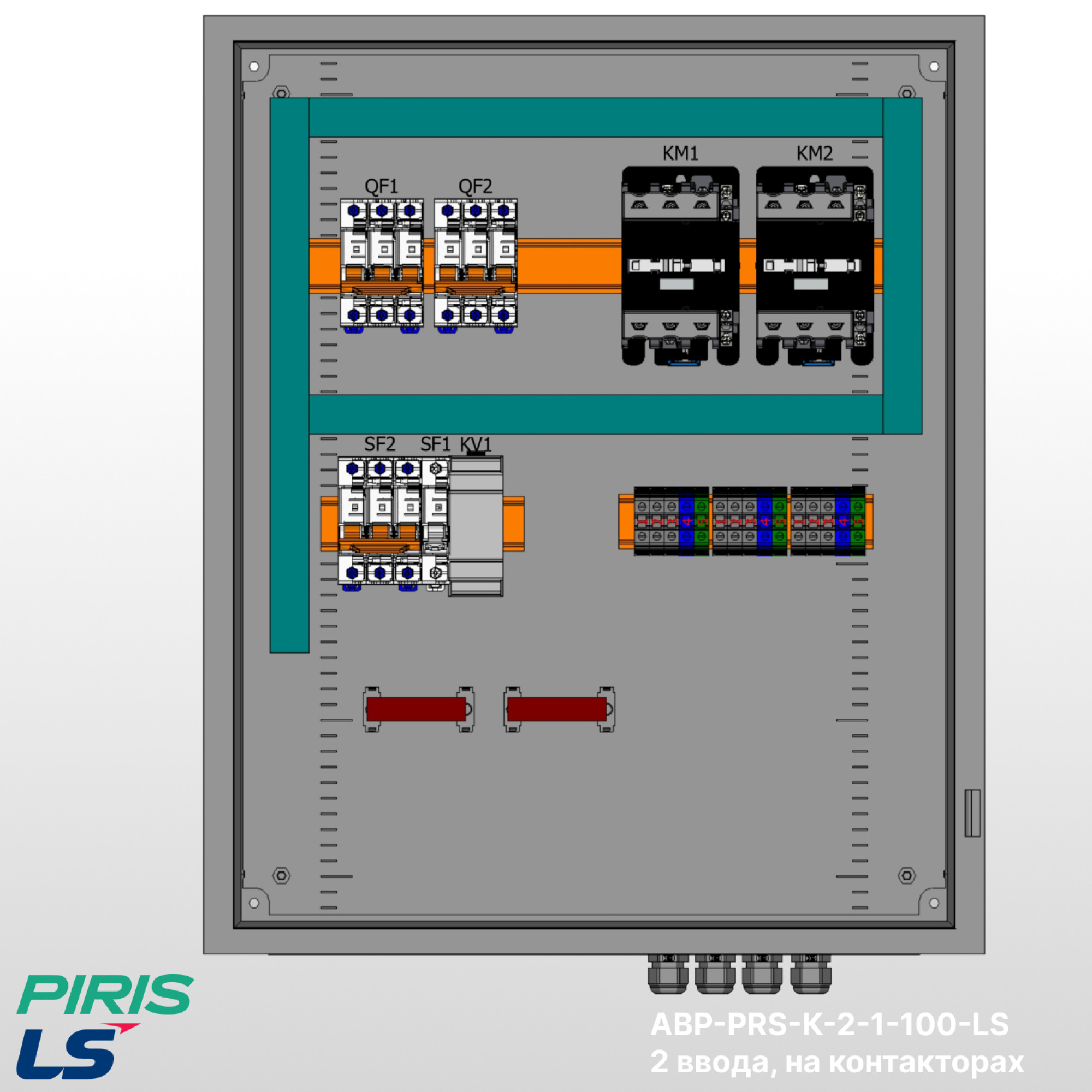 Шкаф АВР-PRS-K-2-1-100-LS имеет возможность подключения вводов снизу, с дополнительной опцией — выводом на клеммы, добавлением секции распределения.