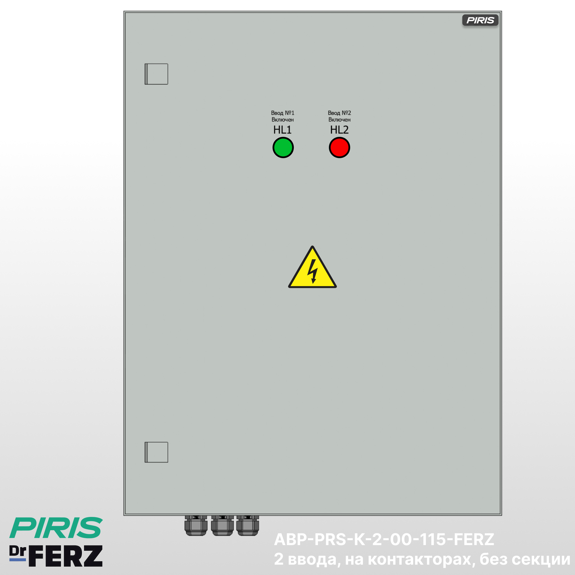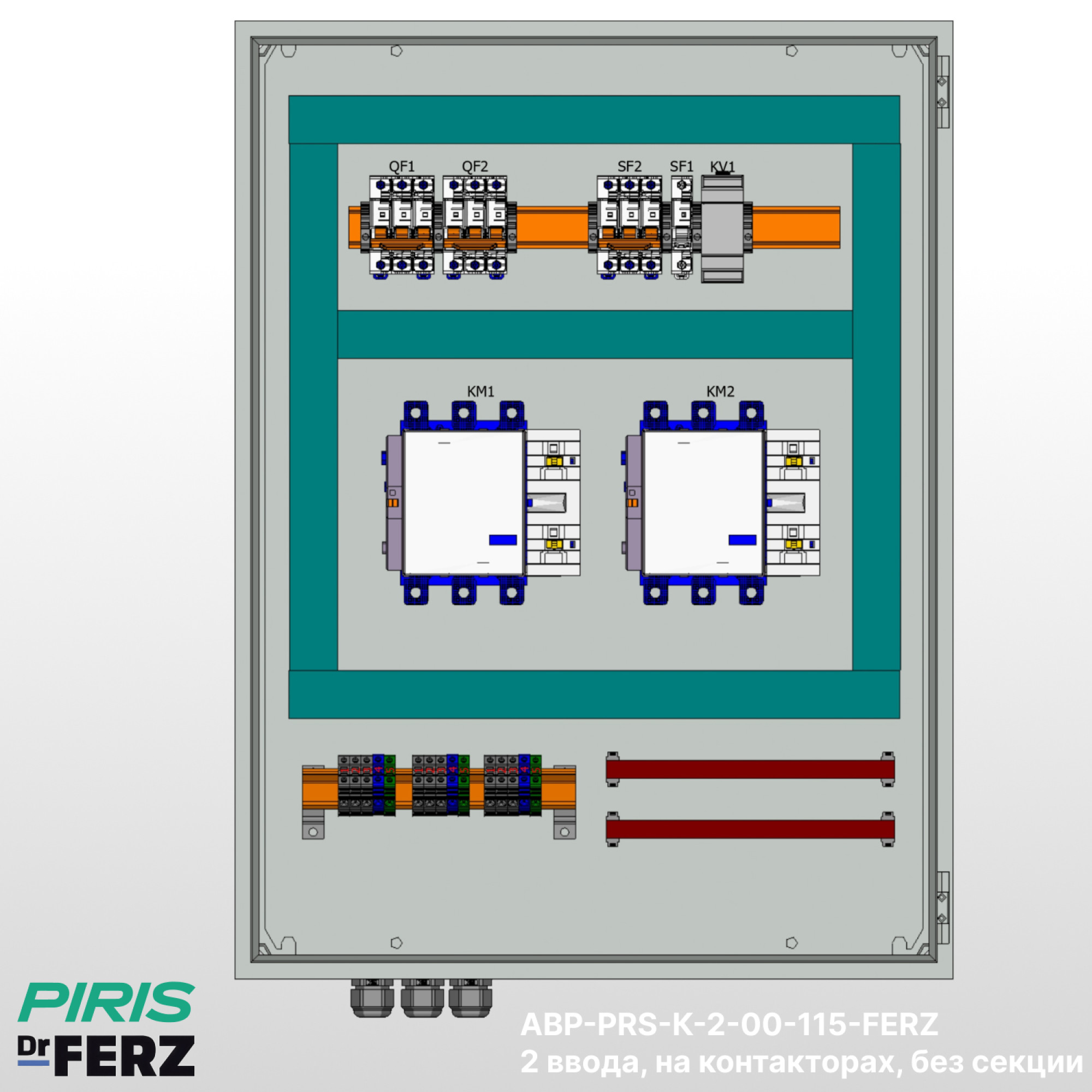 Шкаф АВР-PRS-К-2-1-115-FERZ имеет возможность подключения вводов снизу, с дополнительной опцией — выводом на клеммы, добавлением секции распределения.