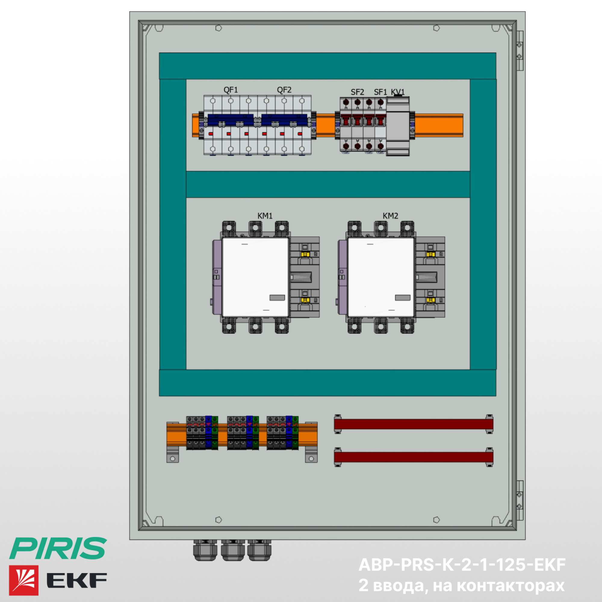 Шкаф АВР-PRS-K-2-1-125-EKF имеет возможность подключения вводов снизу, с дополнительной опцией — выводом на клеммы, добавлением секции распределения.