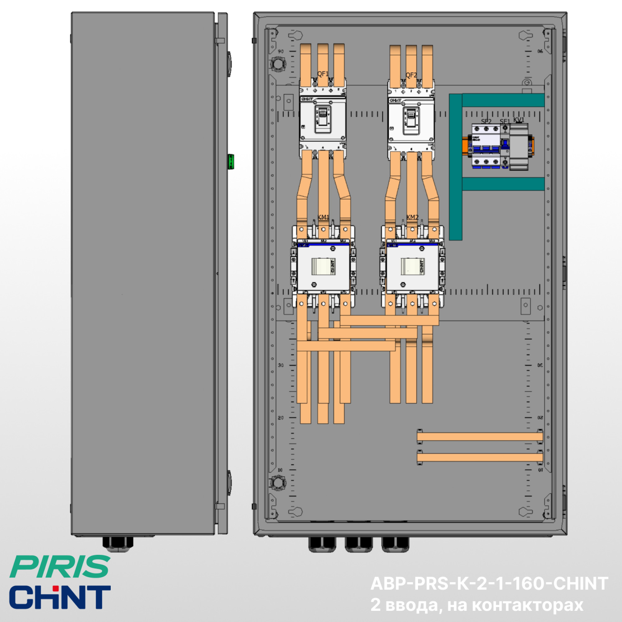 Шкаф АВР-PRS-K-2-1-160-CHINT имеет возможность подключения вводов снизу, с дополнительной опцией — выводом на клеммы, добавлением секции распределения.