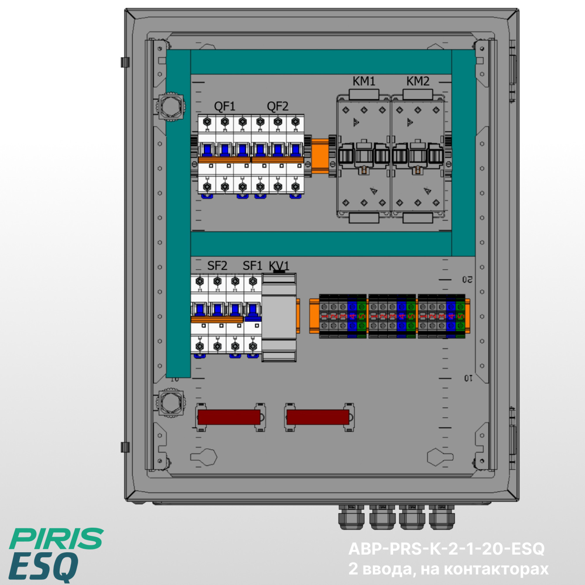 Устройства АВР-PRS-K-2-1-20-ESQ выполнены на модульных автоматических выключателях серии ВА63C-4 и контакторах серии КМ 25А бренда ESQ.