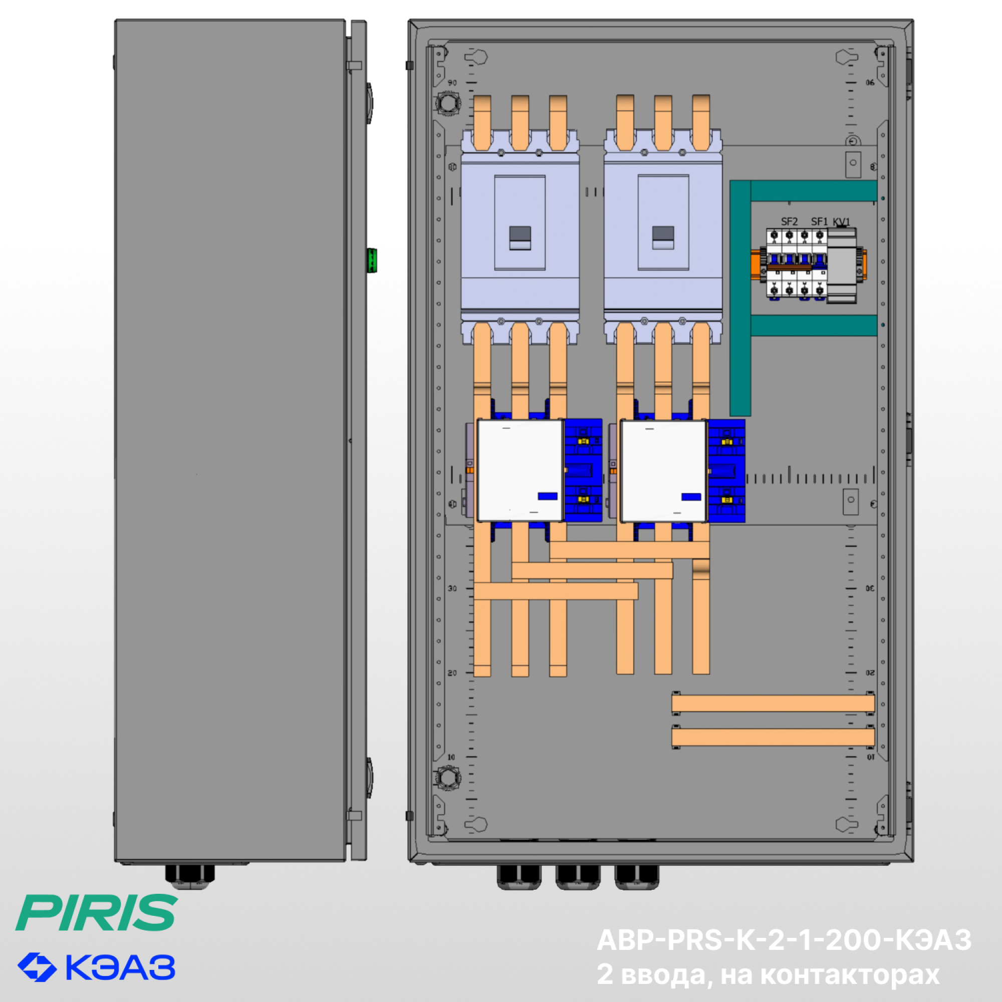 Шкаф АВР-PRS-K-2-1-200-KEAZ имеет возможность подключения вводов снизу, с дополнительной опцией — выводом на клеммы, добавлением секции распределения.