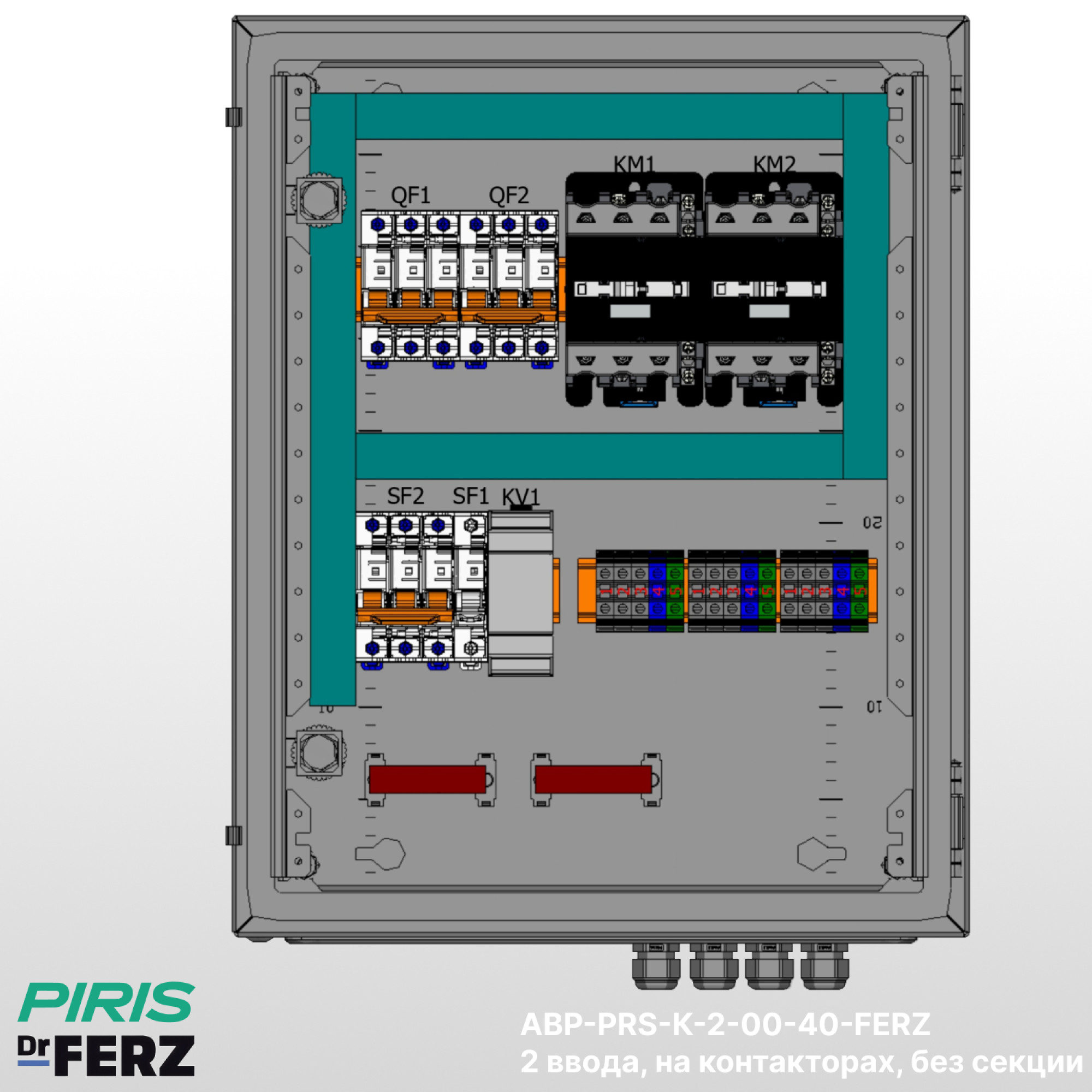 Шкаф АВР-PRS-К-2-1-40-FERZ выполнен на автоматических выключателях FERZ и контакторах FERZ с номинальным током 40А