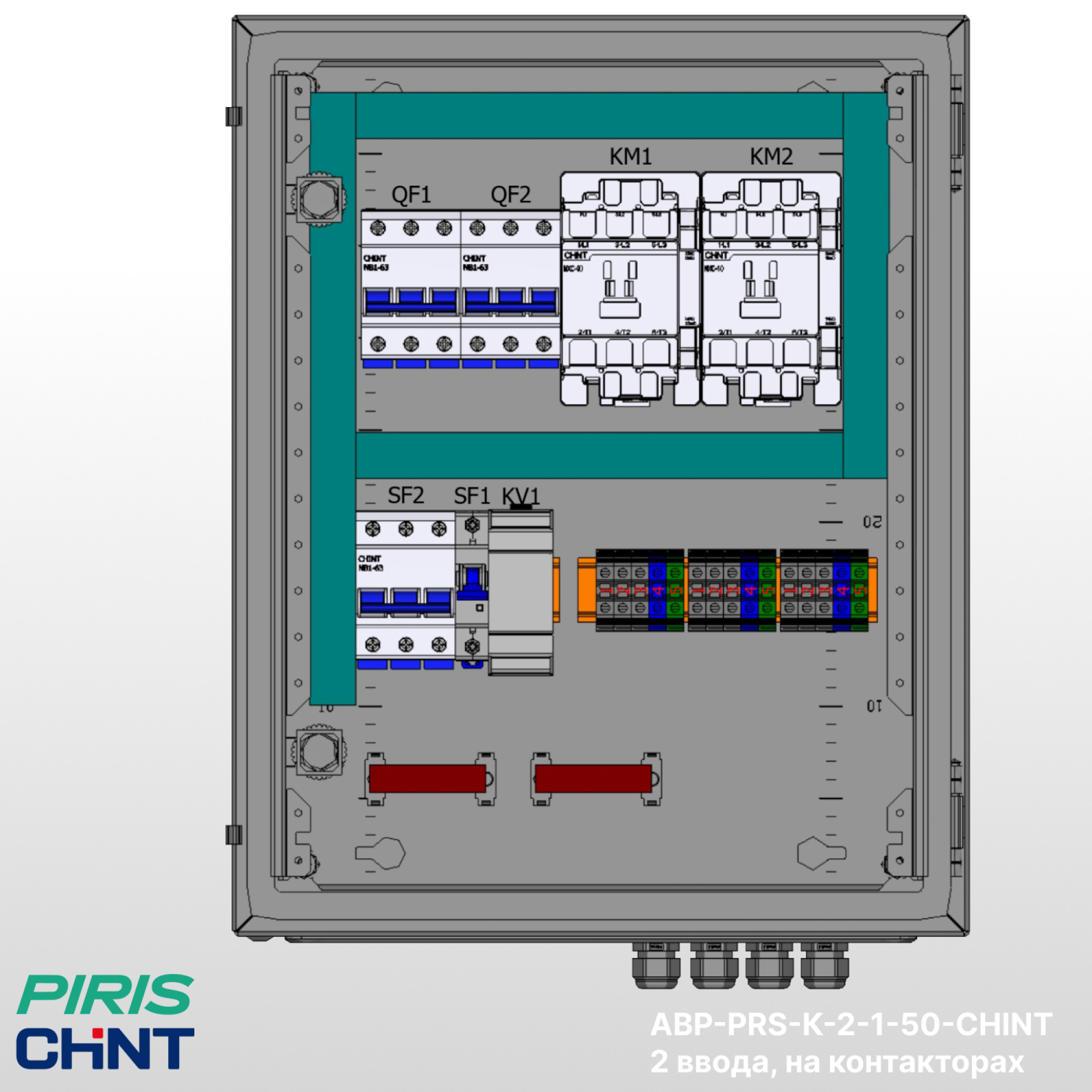 Шкаф АВР-PRS-K-2-1-50-CHINT имеет возможность подключения вводов снизу, с дополнительной опцией — выводом на клеммы, добавлением секции распределения.