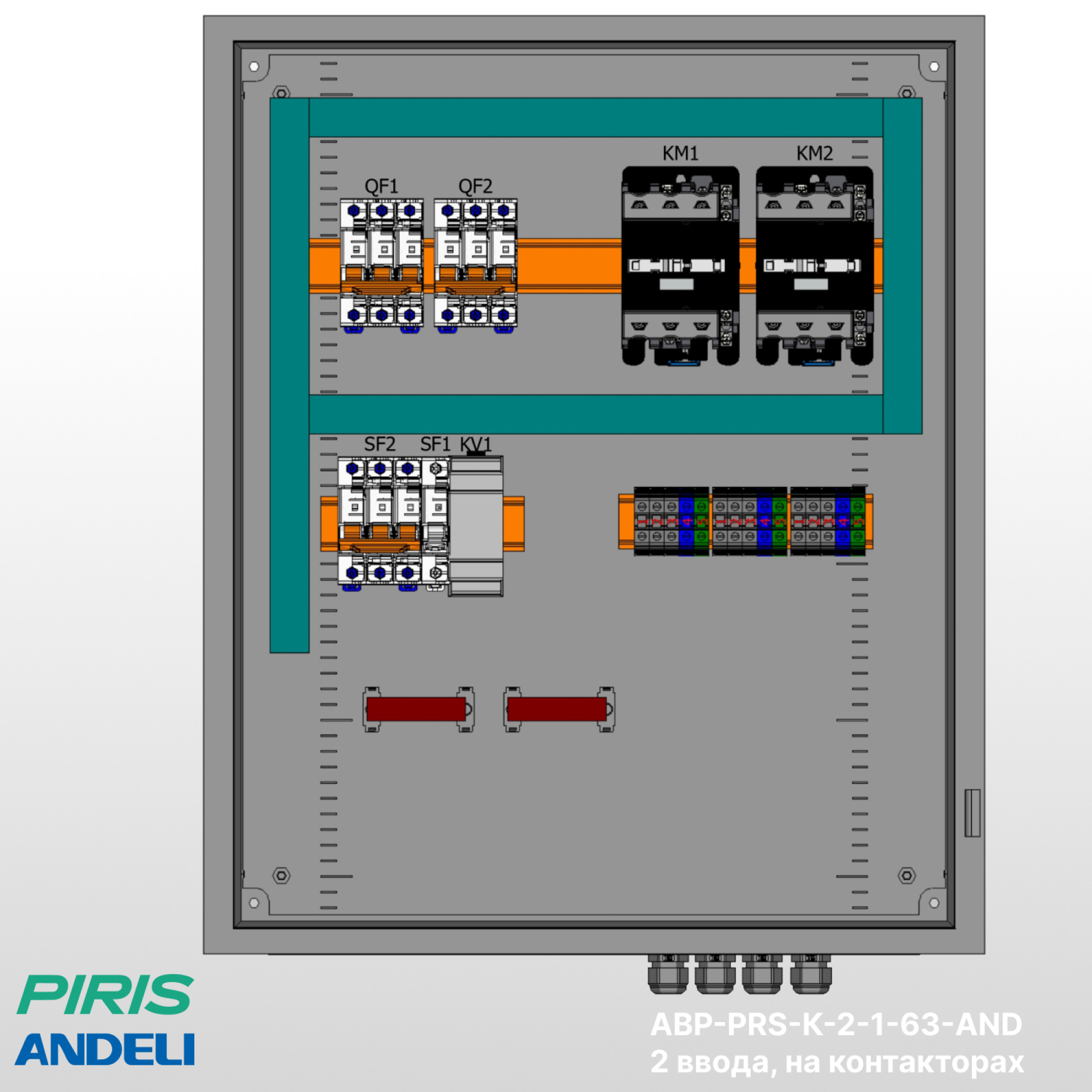 Шкаф АВР-PRS-K-2-1-63-AND имеет возможность подключения вводов снизу, с дополнительной опцией — выводом на клеммы, добавлением секции распределения.