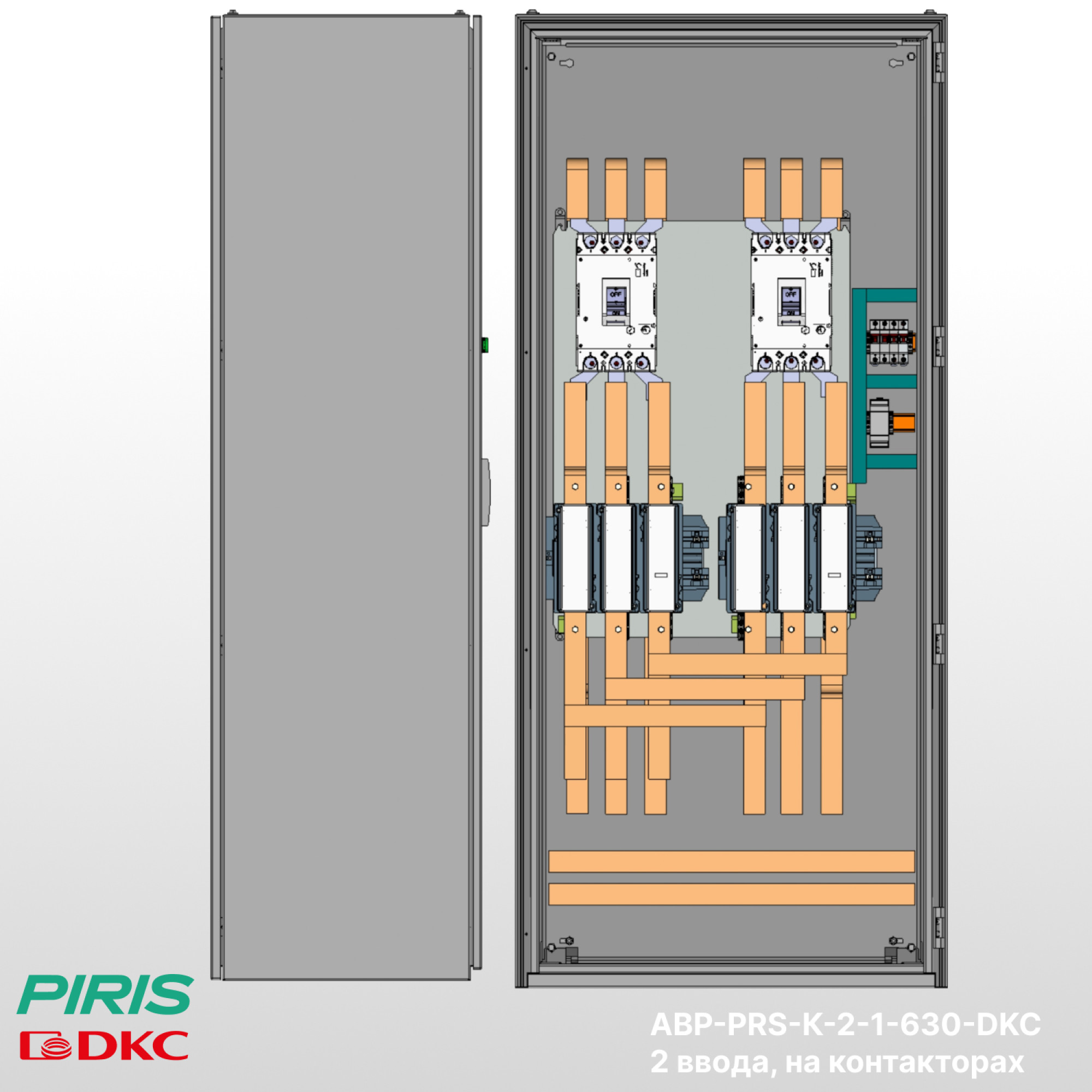Шкаф АВР-PRS-K-2-1-630-DKC имеет возможность подключения вводов снизу, с дополнительной опцией — выводом на клеммы, добавлением секции распределения.