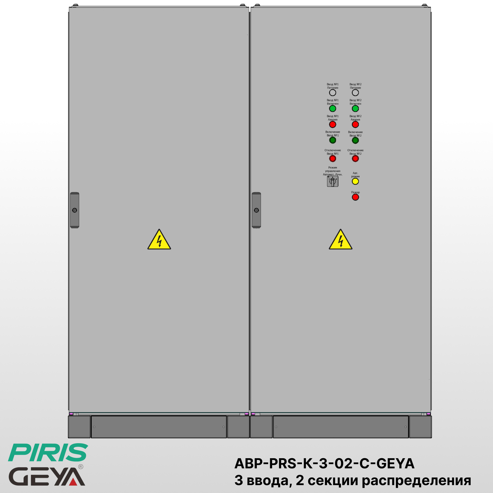 Шкаф автоматического ввода резерва АВР-PRS-К-3-02-С-32-GEYA предназначен для автоматического управления электроснабжением от трёх источников питания (сеть / сеть / ДГУ) — двух сетевых вводов и дизель-генераторной установки. Система обеспечивает питание нагрузки от приоритетного ввода, при отклонении параметров сети выполняет автоматическое переключение на резервный ввод или ДГУ. После восстановления напряжения основной источник вводится в работу автоматически.