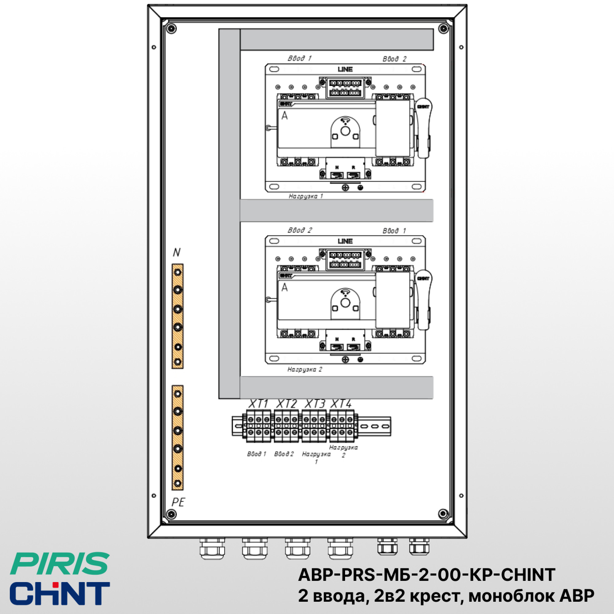 Шкаф автоматического ввода резерва (АВР) АВР-PRS-МБ-2-00-KР-63-CHINT предназначен для автоматического переключения питания между двумя равноценными вводами по схеме «2в2 крест». Конструкция выполнена на базе двух моноблоков АВР NXZM бренда CHINT, что обеспечивает высокий уровень резервирования и надёжности системы электроснабжения.