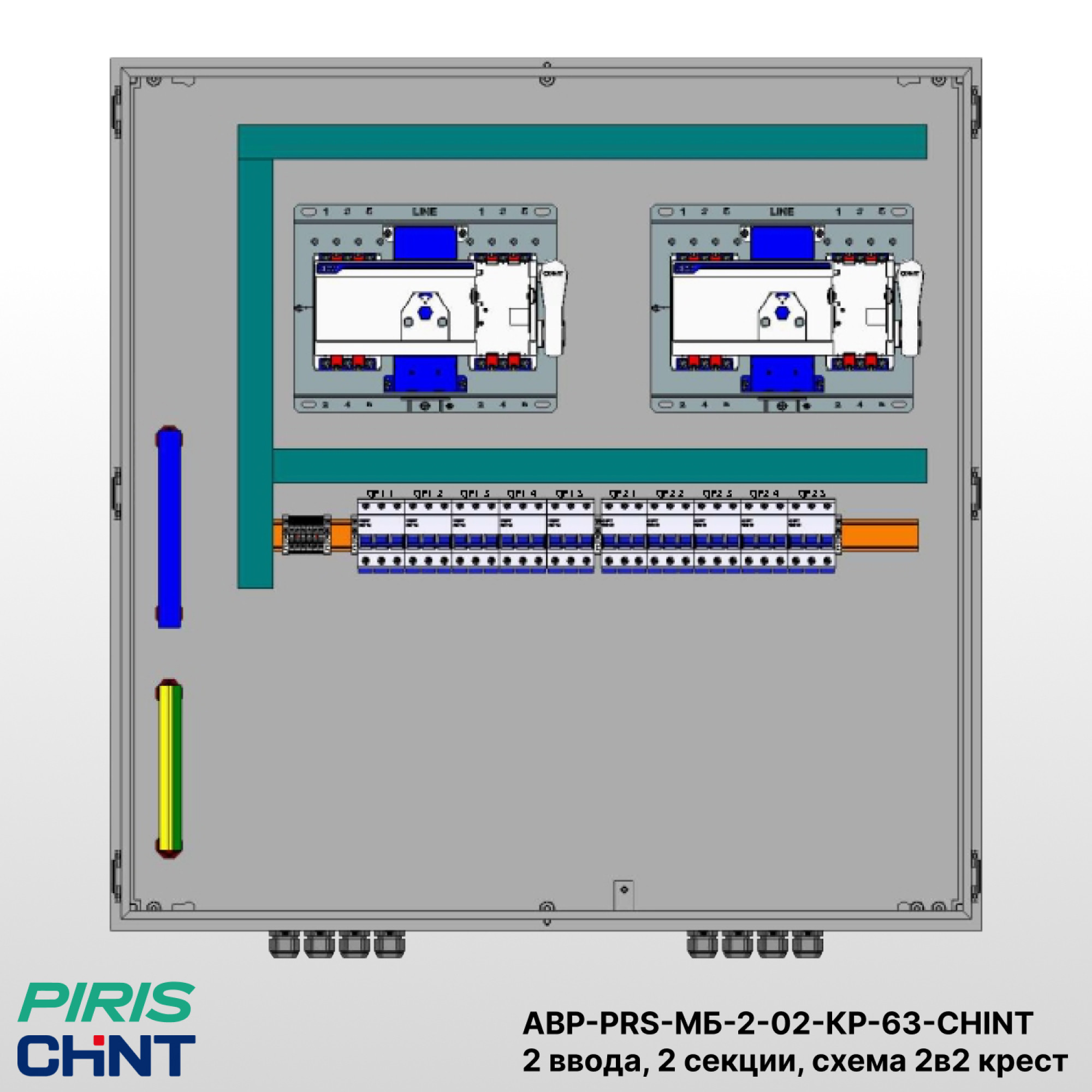 Шкаф автоматического ввода резерва — АВР-PRS-МБ-2-02-KР-63-CHINT навесного исполнения, выполнен в металлическом корпусе в габаритах 1000×1000×300 со степенью защиты IP31 (опционально IP54), предназначен для автоматического переключения питания между двумя независимыми вводами по схеме «2в2 крест» для обеспечения бесперебойного электроснабжения потребителей.