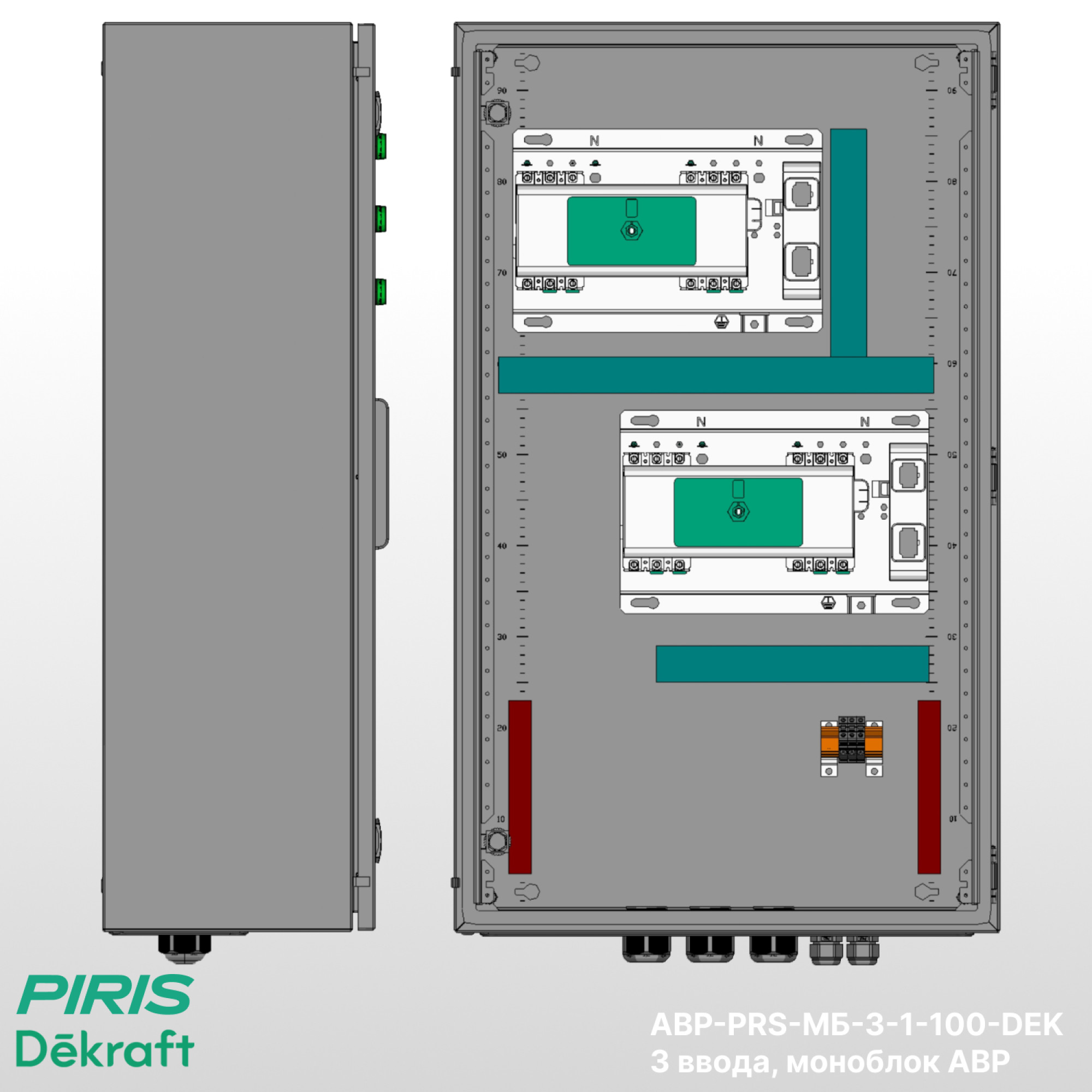 Шкаф АВР-PRS-МБ-3-1-100-DEK предназначен для автоматического переключения между тремя вводами: основным, резервным и генератором (дизельным, бензиновым или газовым). Приоритет вводов задаётся через контроллер, по умолчанию задан приоритет 1-го ввода.