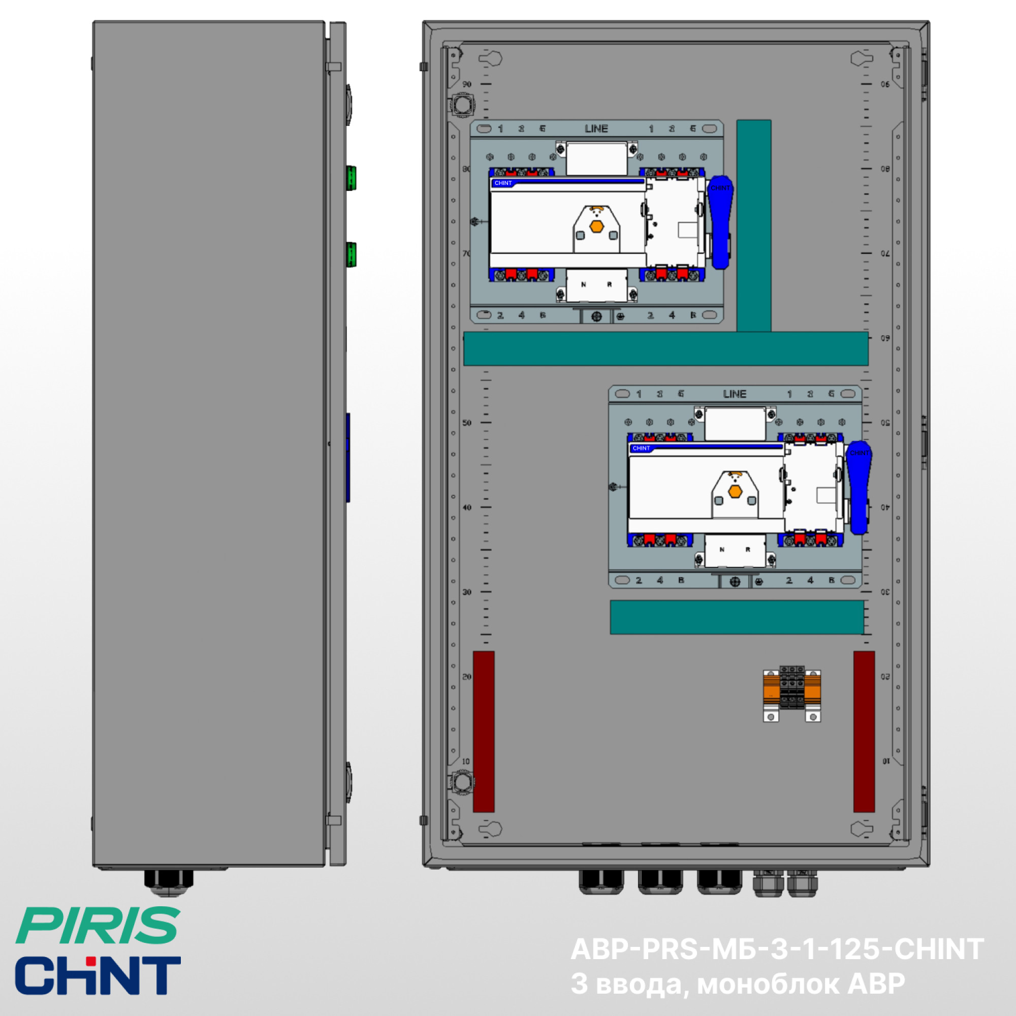 Шкаф АВР-PRS-МБ-3-1-125-CHINT предназначен для автоматического переключения между тремя вводами: основным, резервным и генератором (дизельным, бензиновым или газовым). Приоритет вводов задаётся через контроллер, по умолчанию задан приоритет 1-го ввода.
