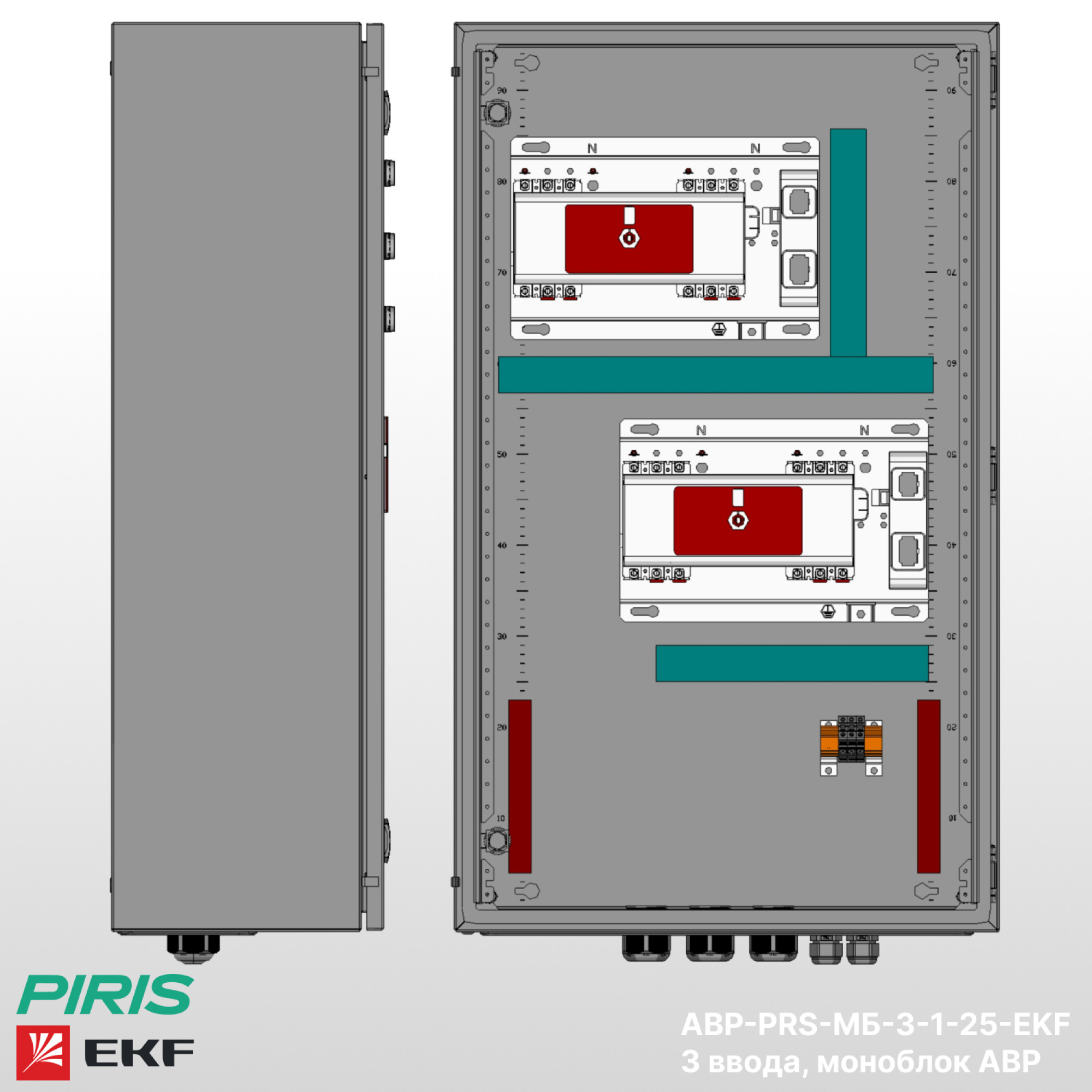 Шкаф АВР-PRS-МБ-3-1-25-EKF предназначен для автоматического переключения между тремя вводами: основным, резервным и генератором (дизельным, бензиновым или газовым). Приоритет вводов задаётся через контроллер, по умолчанию задан приоритет 1-го ввода.