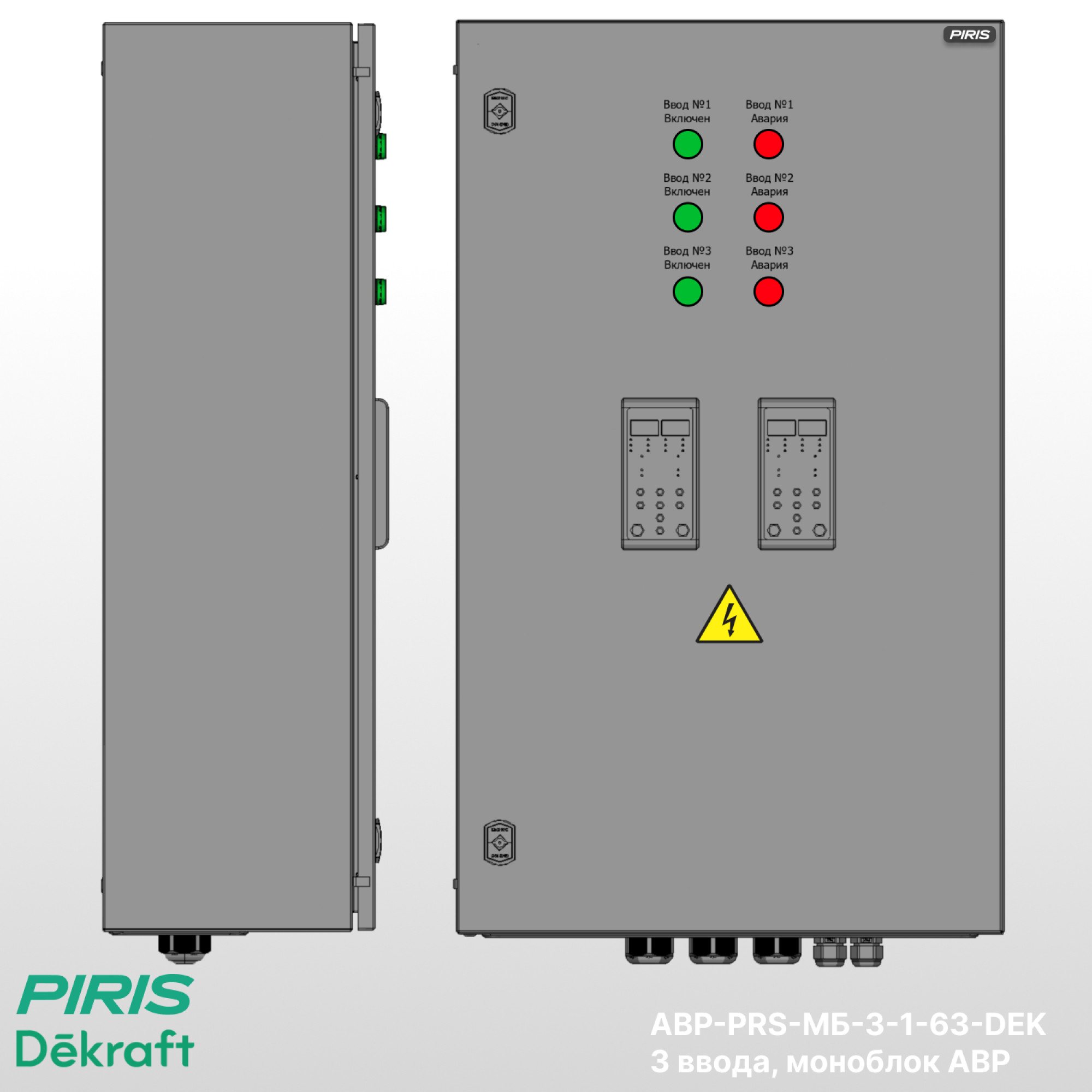 Шкаф АВР-PRS-МБ-3-1-63-DEK предназначен для автоматического переключения между тремя вводами: основным, резервным и генератором (дизельным, бензиновым или газовым). Приоритет вводов задаётся через контроллер, по умолчанию задан приоритет 1-го ввода.