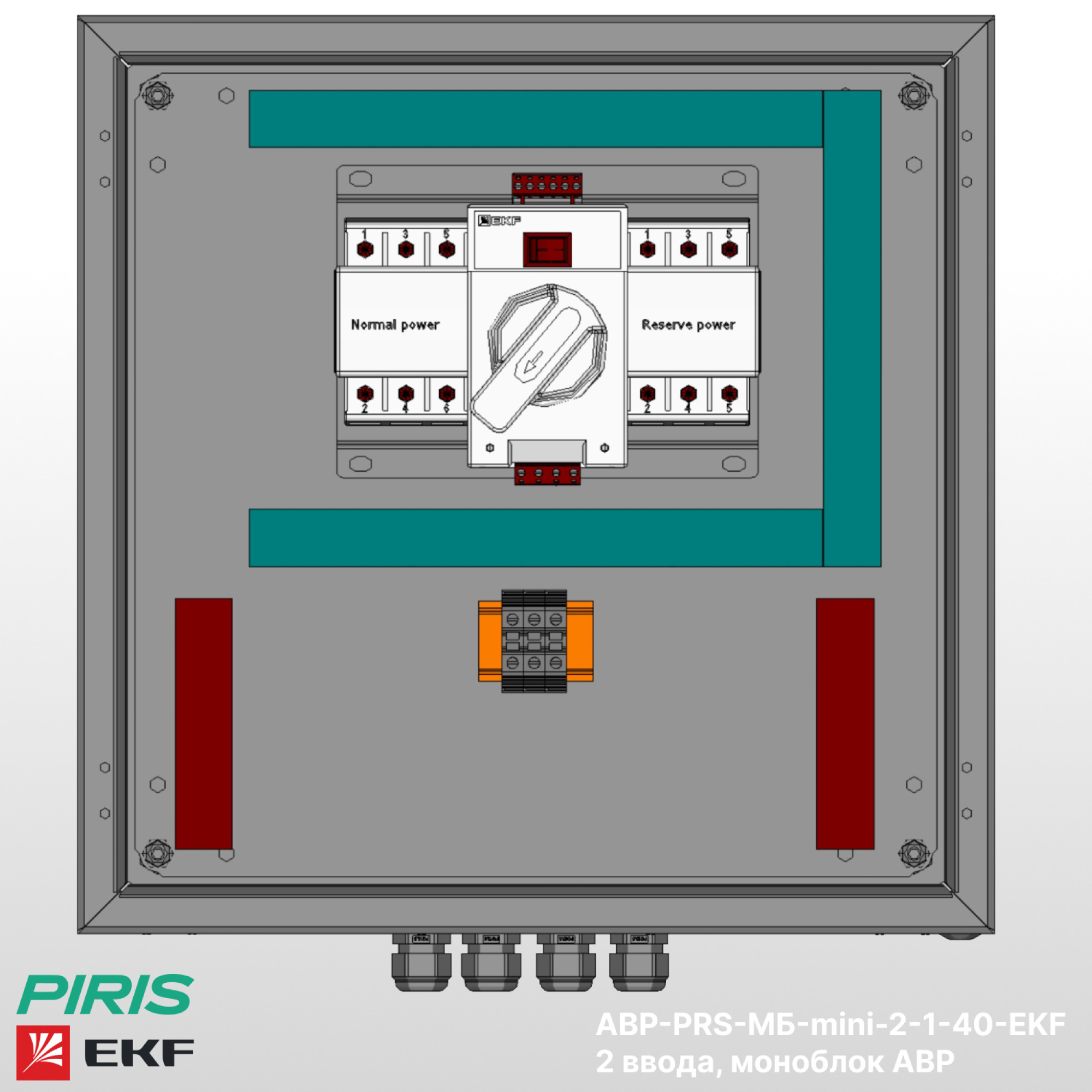 Шкаф автоматического ввода резерва АВР 40А на 2 ввода с выходом на общую систему шин, выполнен на базе моноблочного АВР в металлическом корпусе со степенью защиты IP31. В основе моноблочного АВР два автоматических выключателя в литом корпусе с одним общим моторным приводом. Резервным источником питания в такой схеме может быть как сетевой ввод от подстанции, так и ввод от резервного генератора.