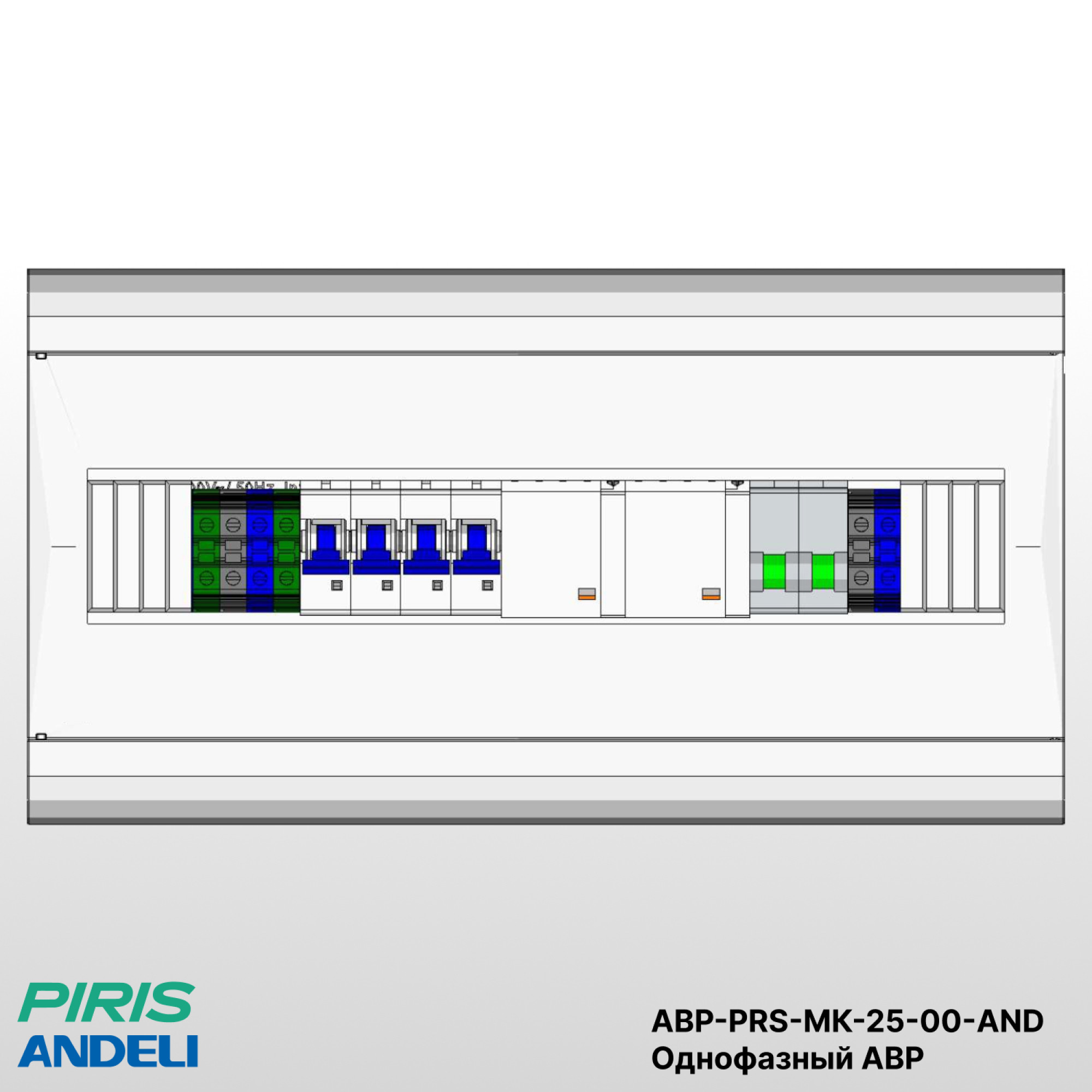 Шкаф автоматического ввода резерва — АВР-PRS-МК-25-00-AND навесного исполнения, в пластиковом корпусе габаритами 197×369×95 мм со степенью защиты IP41, предназначен для автоматического переключения однофазной нагрузки на резервный ввод при пропадании напряжения на основном источнике питания.