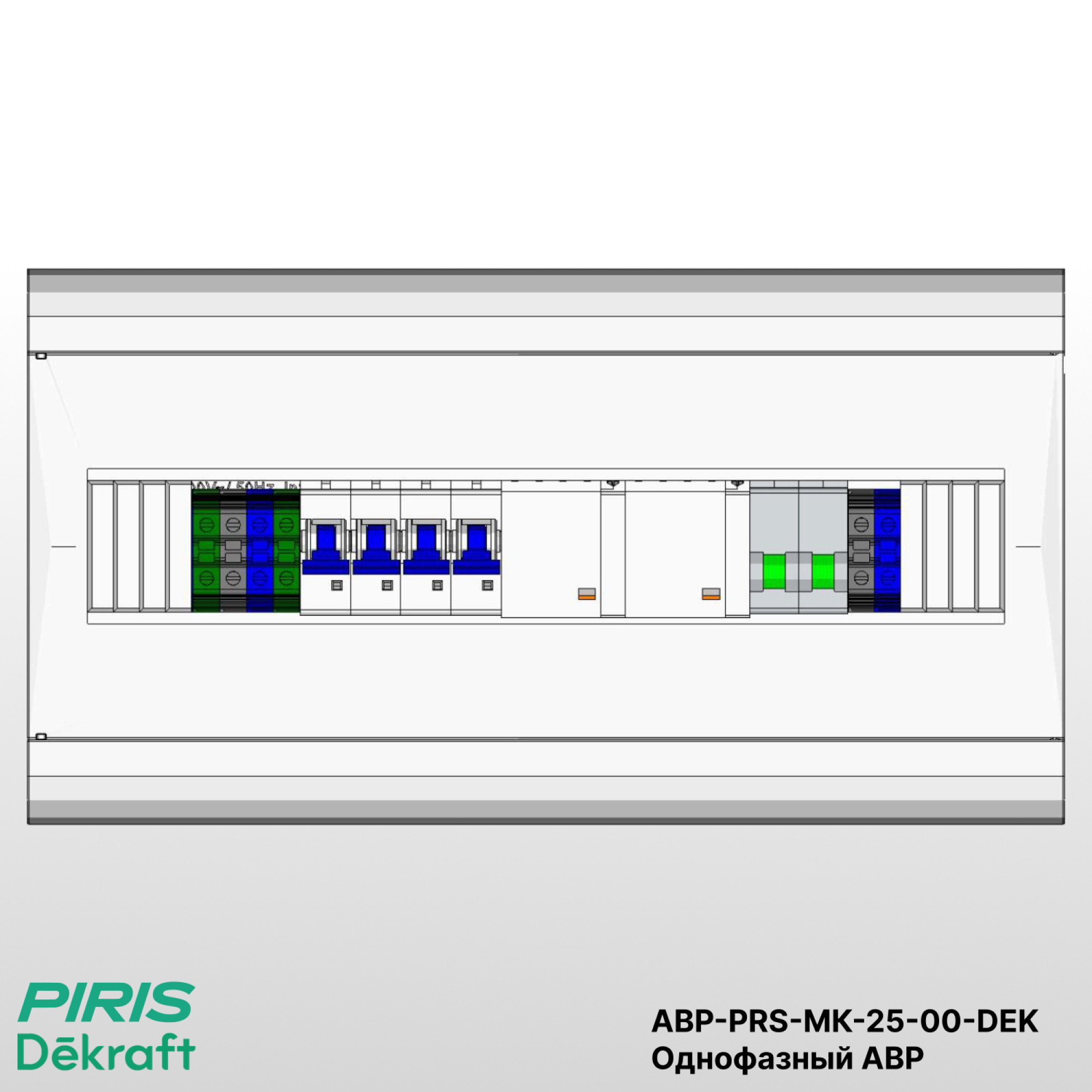 Шкаф автоматического ввода резерва — АВР-PRS-МК-25-00-DEK навесного исполнения, в пластиковом корпусе габаритами 197×369×95 мм со степенью защиты IP41, предназначен для автоматического переключения однофазной нагрузки на резервный ввод при пропадании напряжения на основном источнике питания.