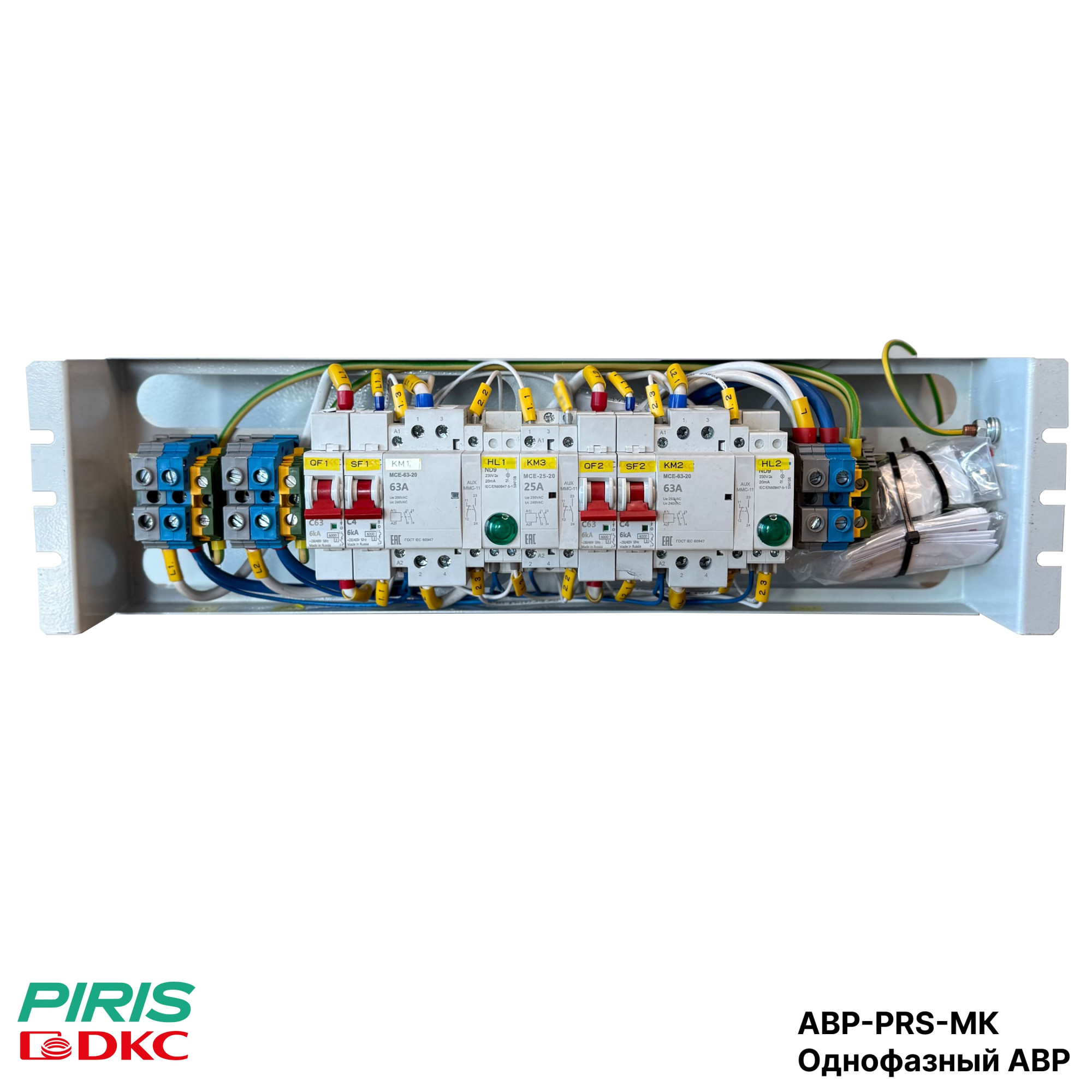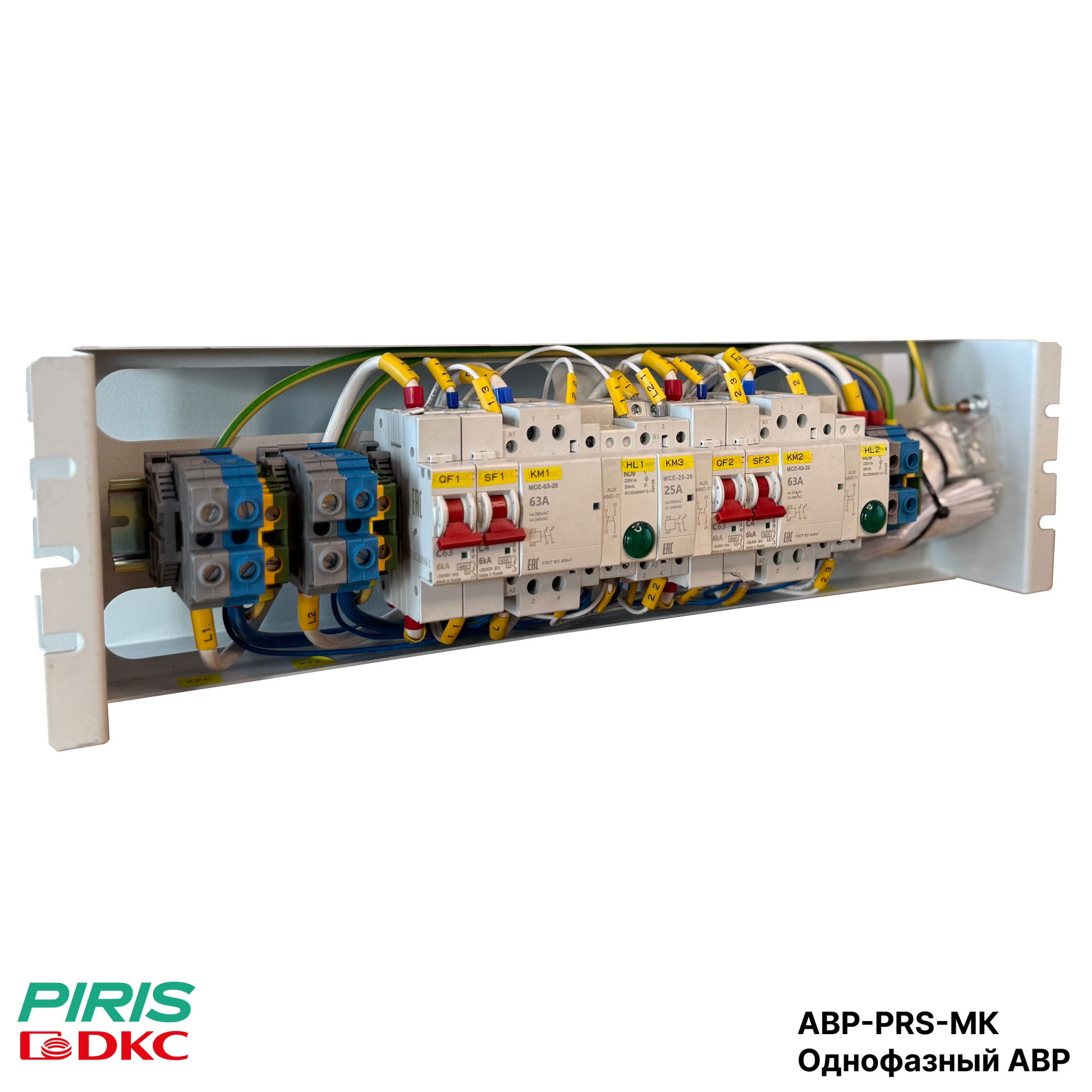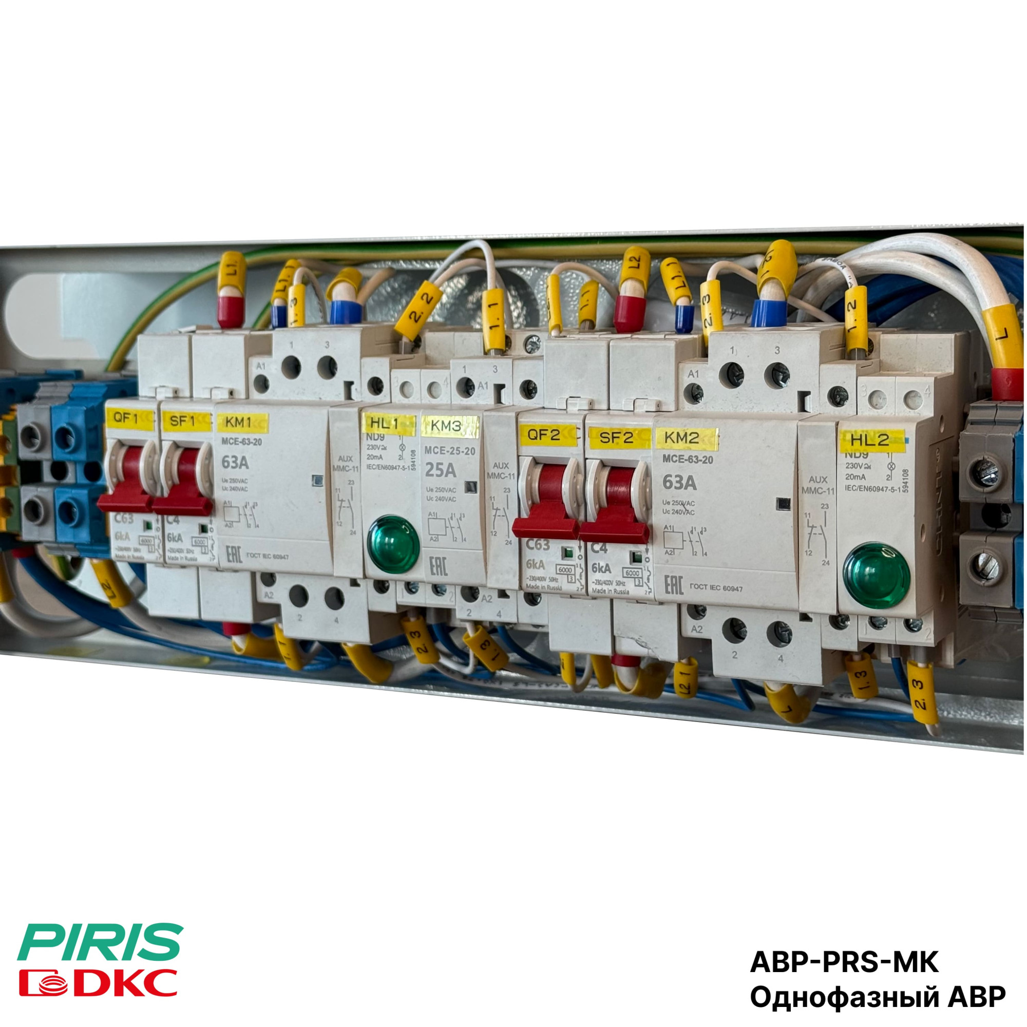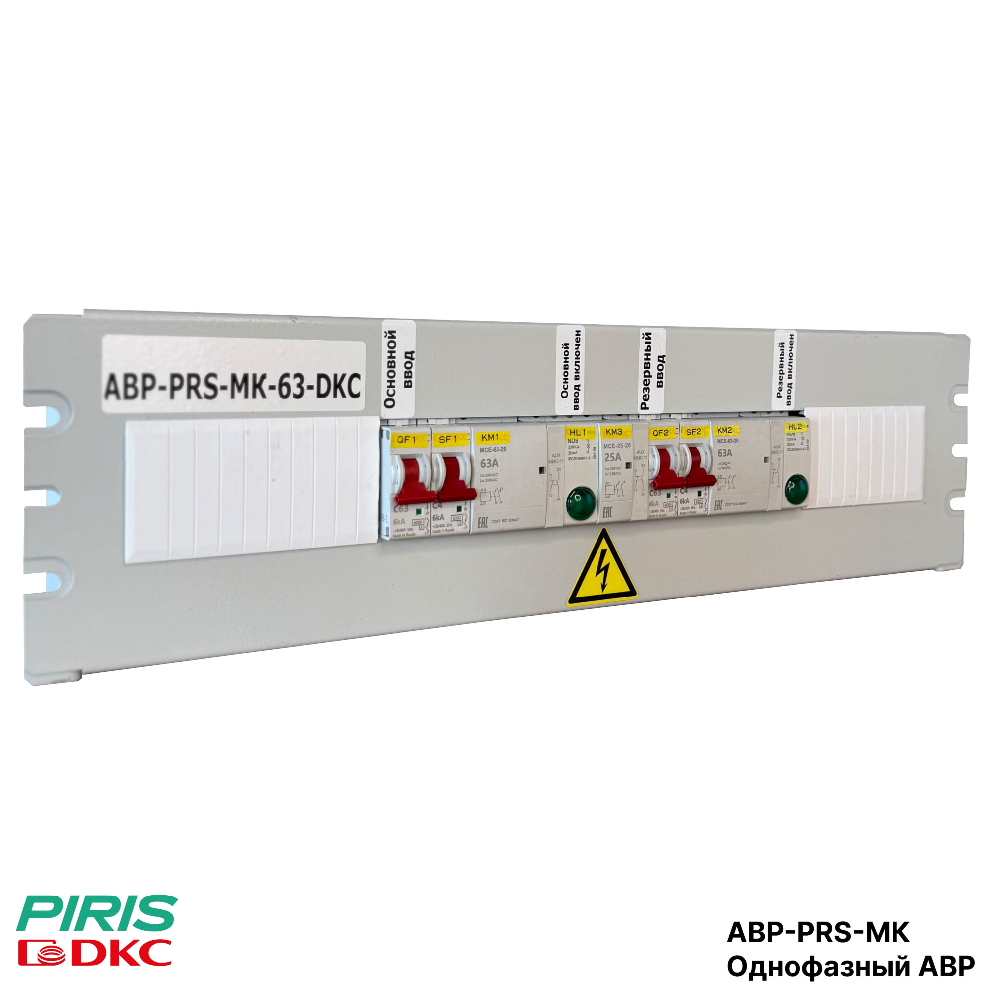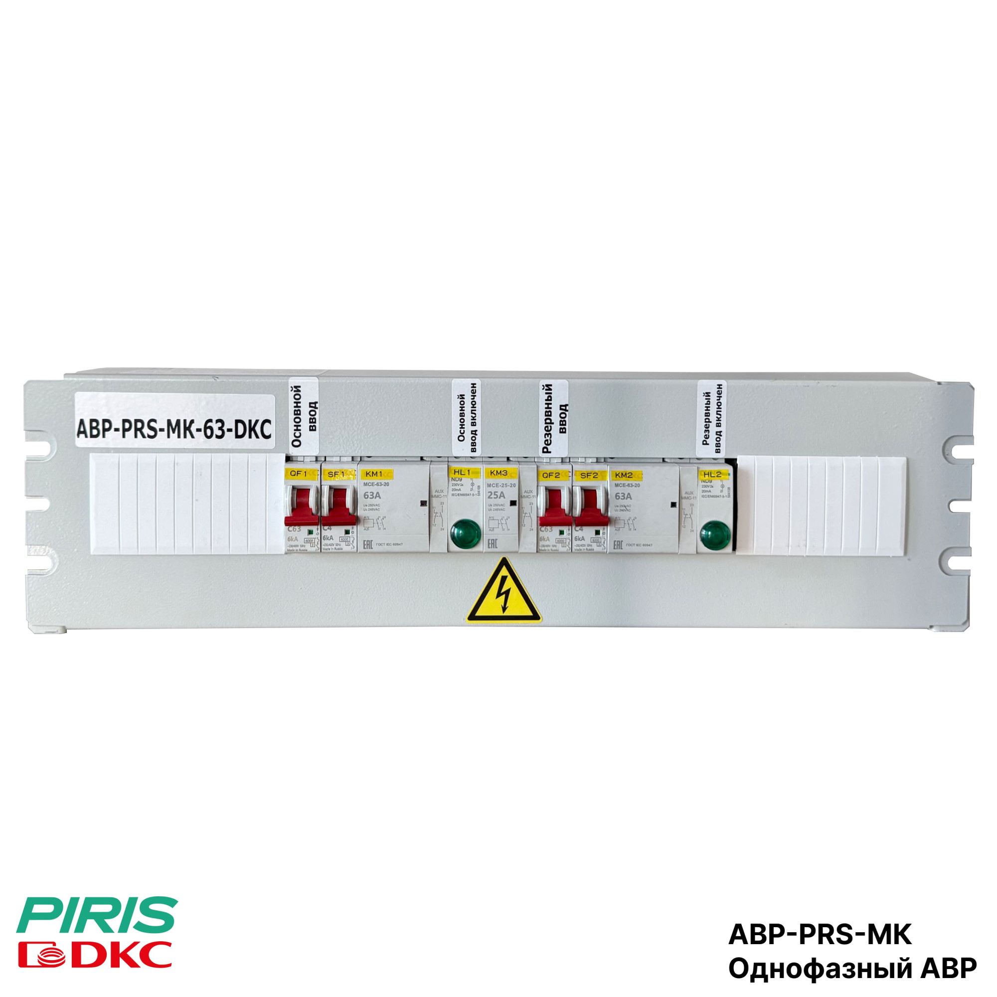 Однофазный АВР-PRS-МК 40А, 220В выполнен на модульных контакторах DKC (магнитных пускателях). Артикул изделия — АВР-PRS-МК-40-DKC, напряжение цепи управления 220В, 50Гц, приоритет работы установлен на 1-й ввод.