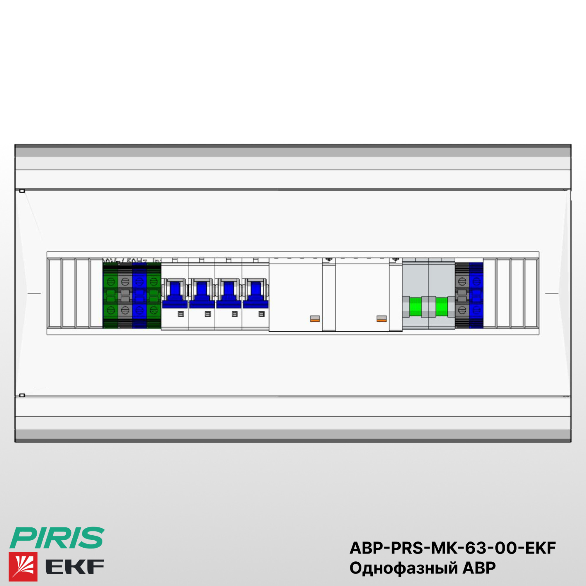 Шкаф автоматического ввода резерва — АВР-PRS-МК-63-00-EKF навесного исполнения, в пластиковом корпусе габаритами 197×369×95 мм со степенью защиты IP41, предназначен для автоматического переключения однофазной нагрузки на резервный ввод при пропадании напряжения на основном источнике питания.