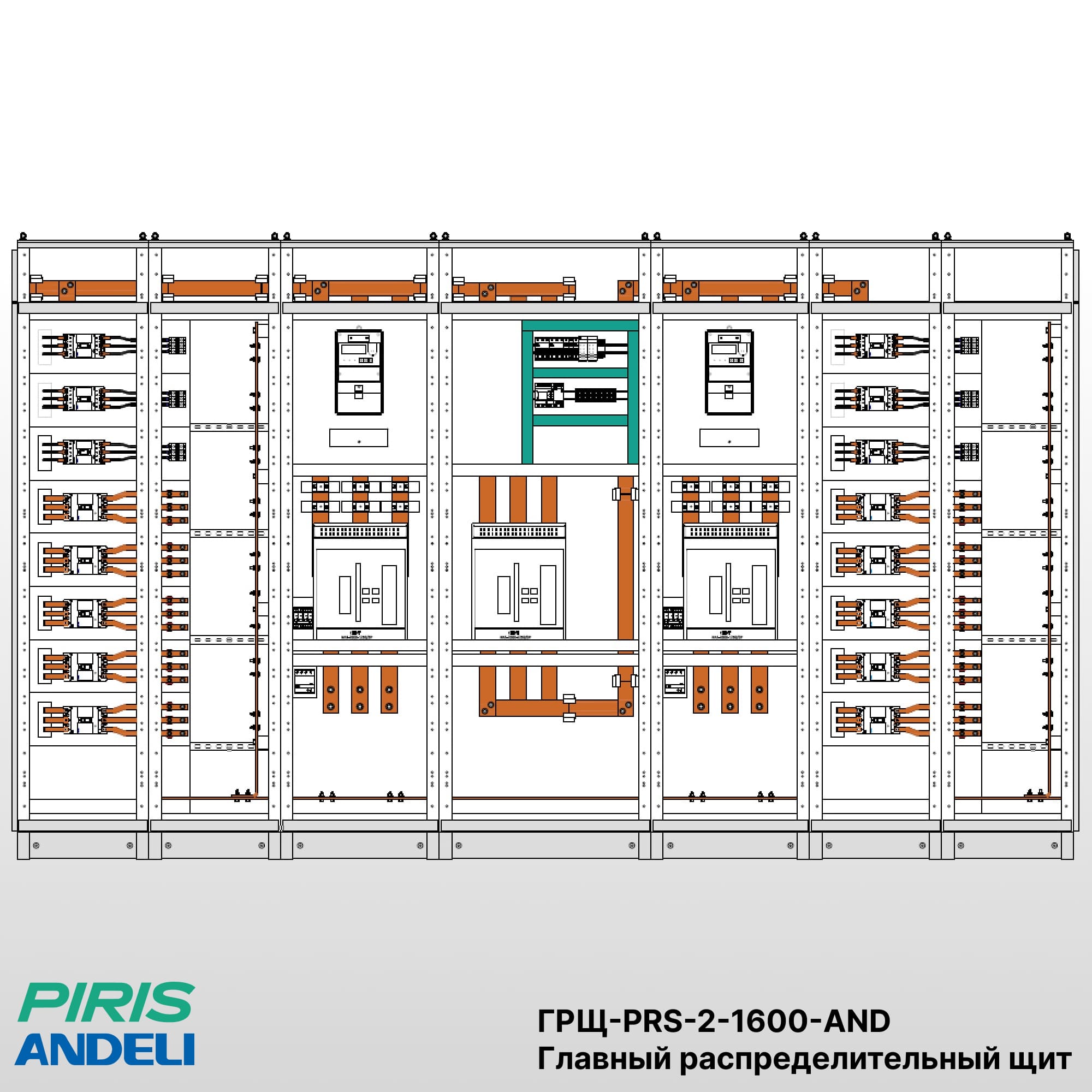 Конструкция ГРЩ ГРЩ-PRS-2-1600-AND предусматривает вводные и линейные панели, секционный аппарат (при наличии), систему медных шин, аппаратуру защиты и коммутации отходящих линий.