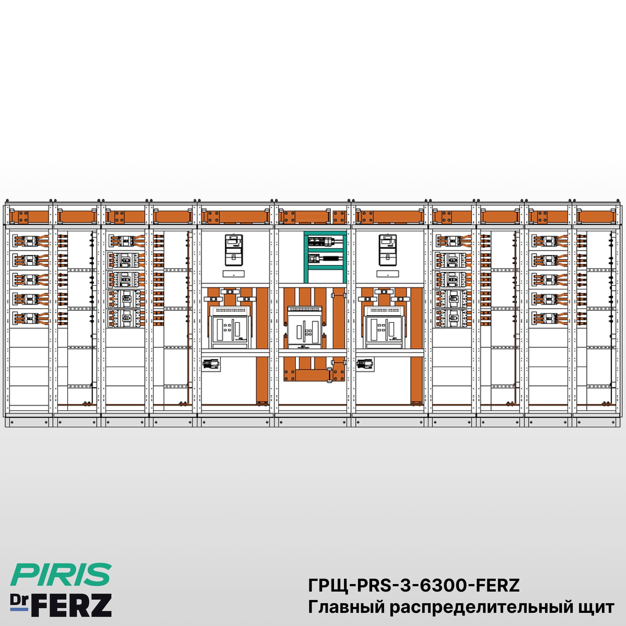 Конструкция ГРЩ ГРЩ-PRS-3-6300-FERZ включает вводные панели, панель ДГУ, секционный аппарат (при наличии), систему медных шин с заданным током КЗ и аппаратные блоки защиты и коммутации отходящих линий. Щит применяется как основной распределительный центр на объекте с требованием обеспечения непрерывного электропитания.