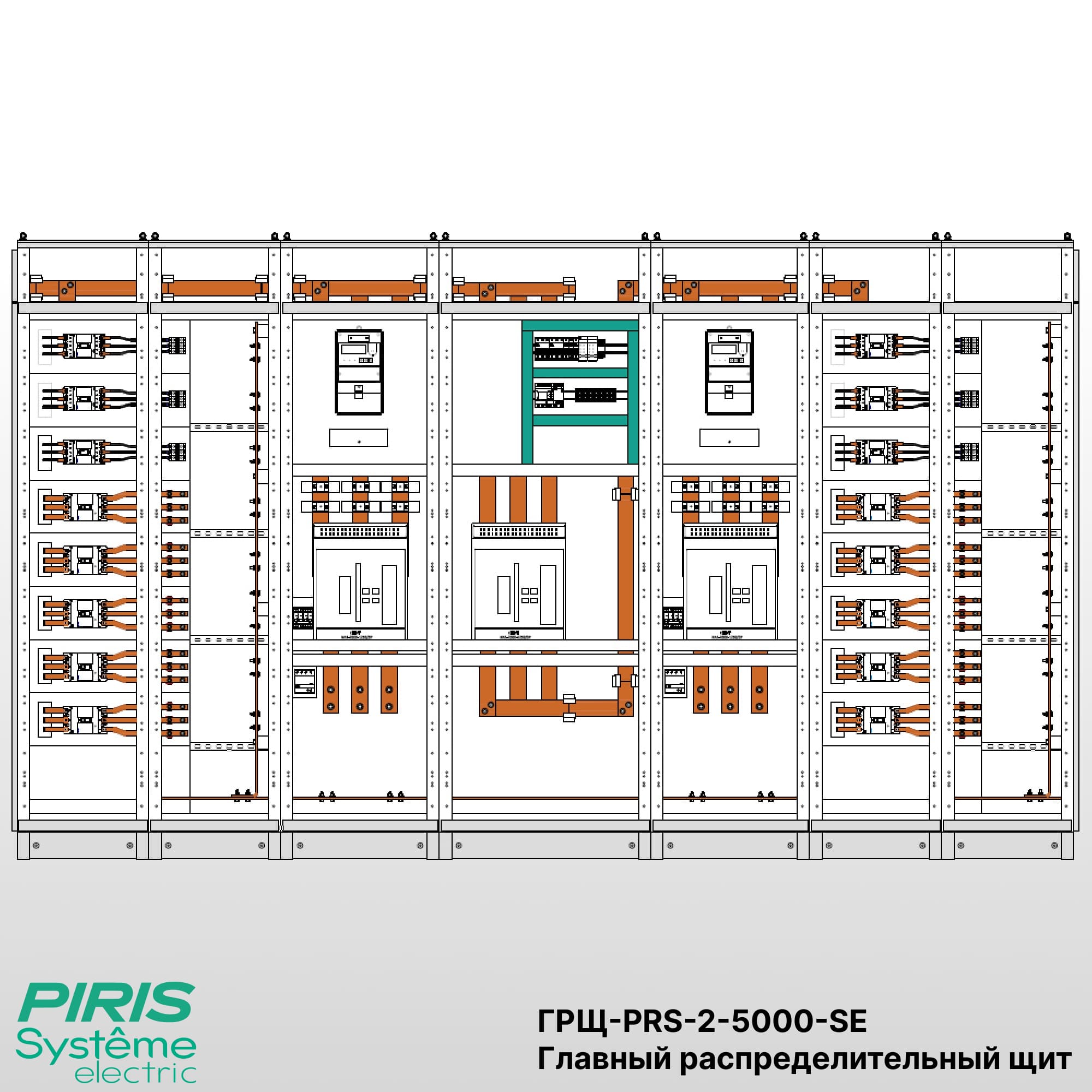 Конструкция ГРЩ ГРЩ-PRS-2-5000-SE предусматривает вводные и линейные панели, секционный аппарат (при наличии), систему медных шин, аппаратуру защиты и коммутации отходящих линий.