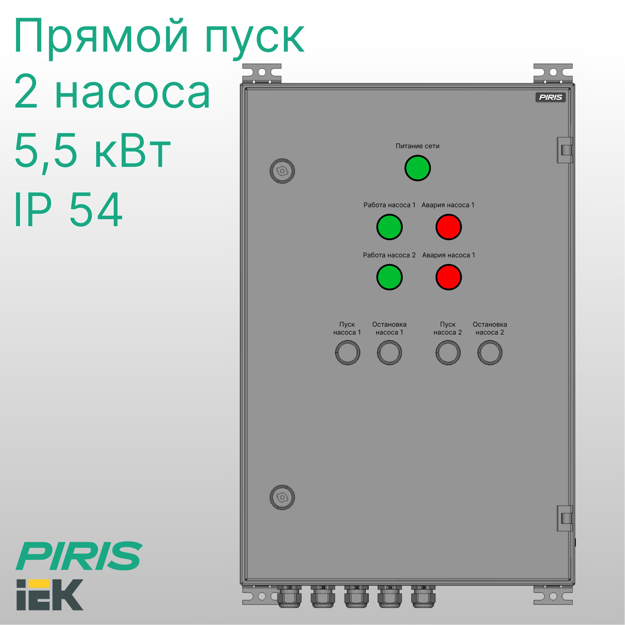 Шкаф управления обеспечивает защиту насосов от сухого хода, короткого замыкания, тепловой перегрузки по току, перегрева двигателя, а также от попадания, перекоса или неправильной последовательности подключения фаз.