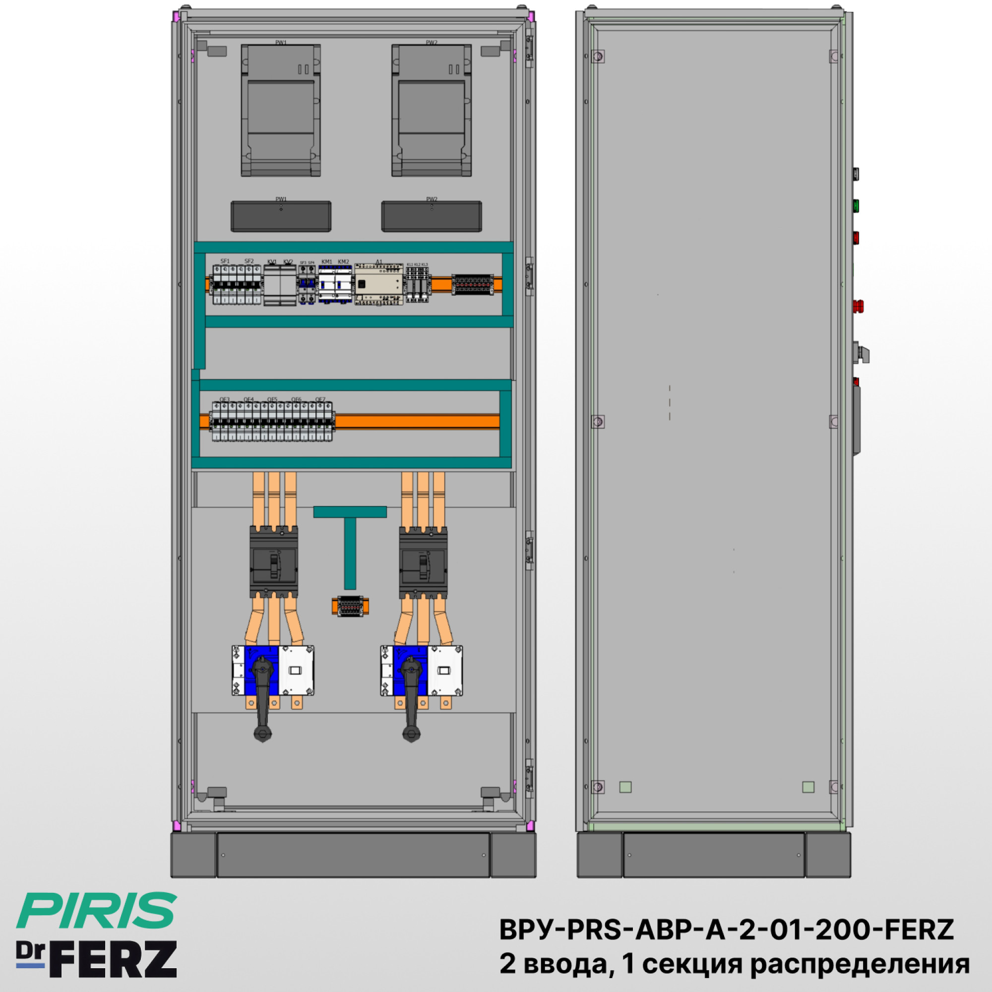 Вводно-распределительное устройство с АВР — ВРУ-PRS-АВР-А-2-01-200-FERZ напольного исполнения, из цельносварного корпуса в габаритах 1800×800×600 со степенью защиты IP31, предназначено для ввода и распределения питания силового оборудования 1-й категории электроприёмников, когда перерыв в электроснабжении недопустим.