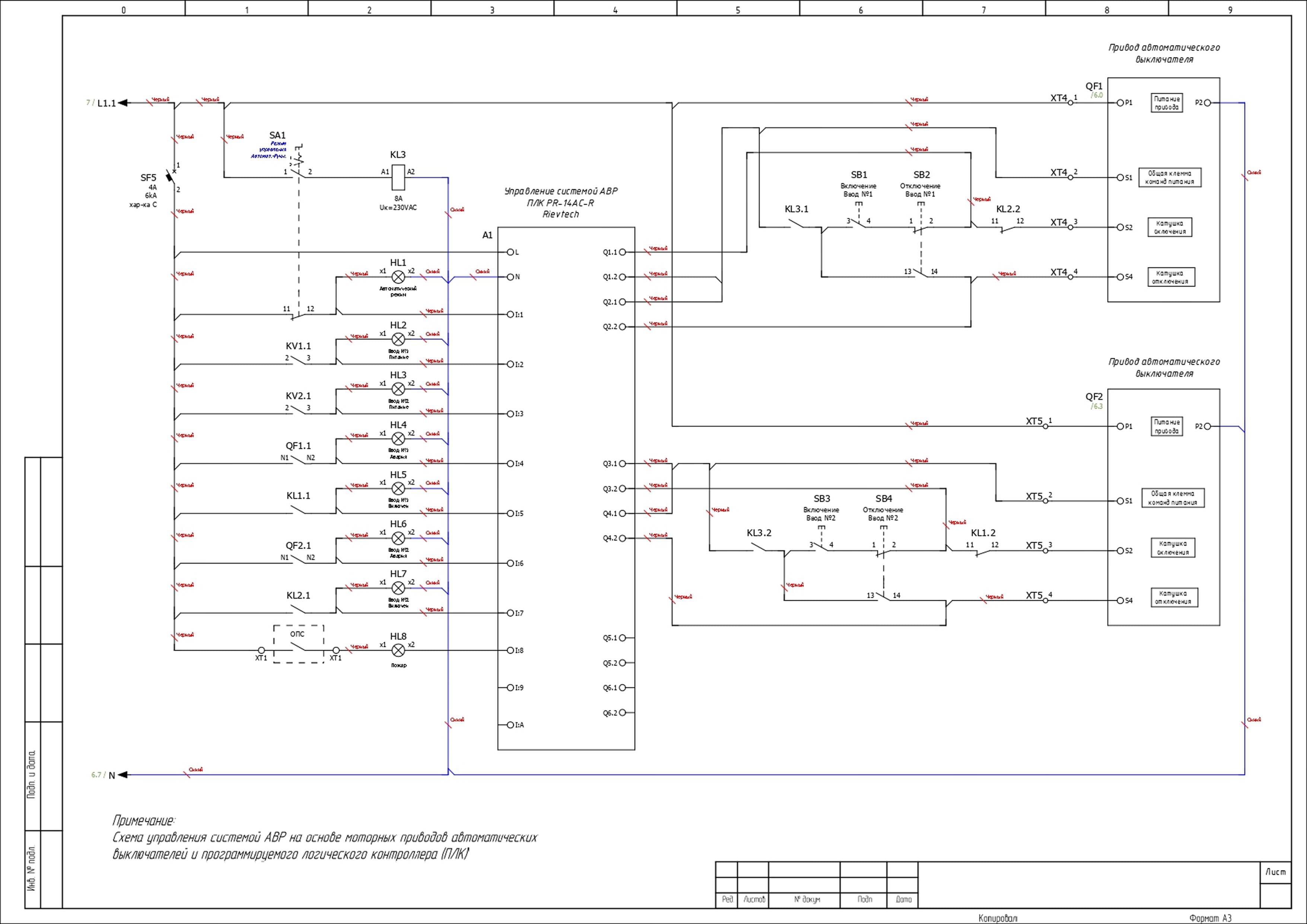 ВРУ-PRS-АВР-А-2-00-100-FERZ оснащен системой автоматического ввода резерва. Управление осуществляется автоматическими выключателями в литом корпусе Dr.FERZ в литом корпусе FPC-21-N-100-TM-D/3P 100А 50кА с рег. термомаг. расцепителем с термомагнитным расцепителем совместно с контроллером ПЛК Rievtech PR-14AC-R. Ресурс выходных реле контроллера — до 100 000 коммутационных циклов при номинальной нагрузке (AC-1), что обеспечивает длительную и стабильную работу.