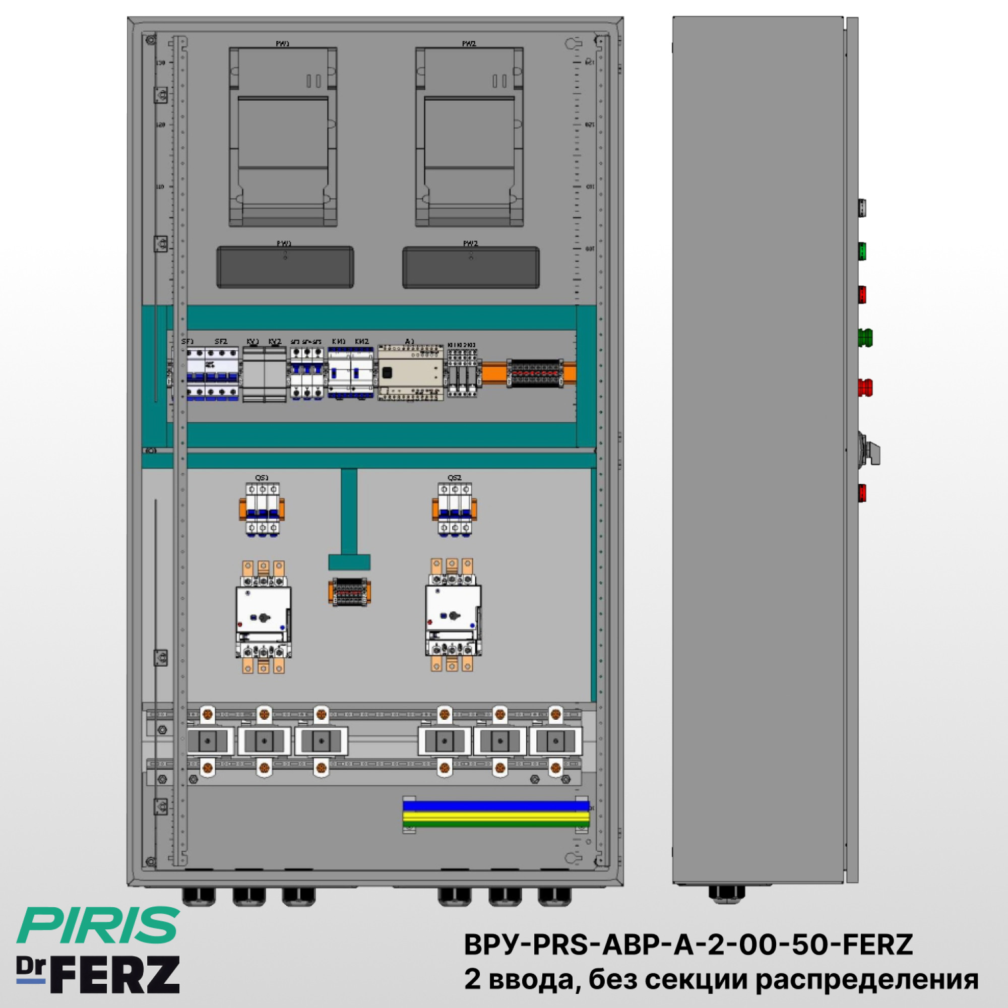 Вводно-распределительное устройство с автоматическим вводом резерва ВРУ-PRS-АВР-А-2-00-50-FERZ предназначено для приёма и автоматического распределения питания между двумя независимыми вводами. Щит ВРУ-PRS-АВР-А-2-00-50-FERZ обеспечивает надёжное электроснабжение потребителей 1-й категории, где перерыв в подаче электроэнергии недопустим.