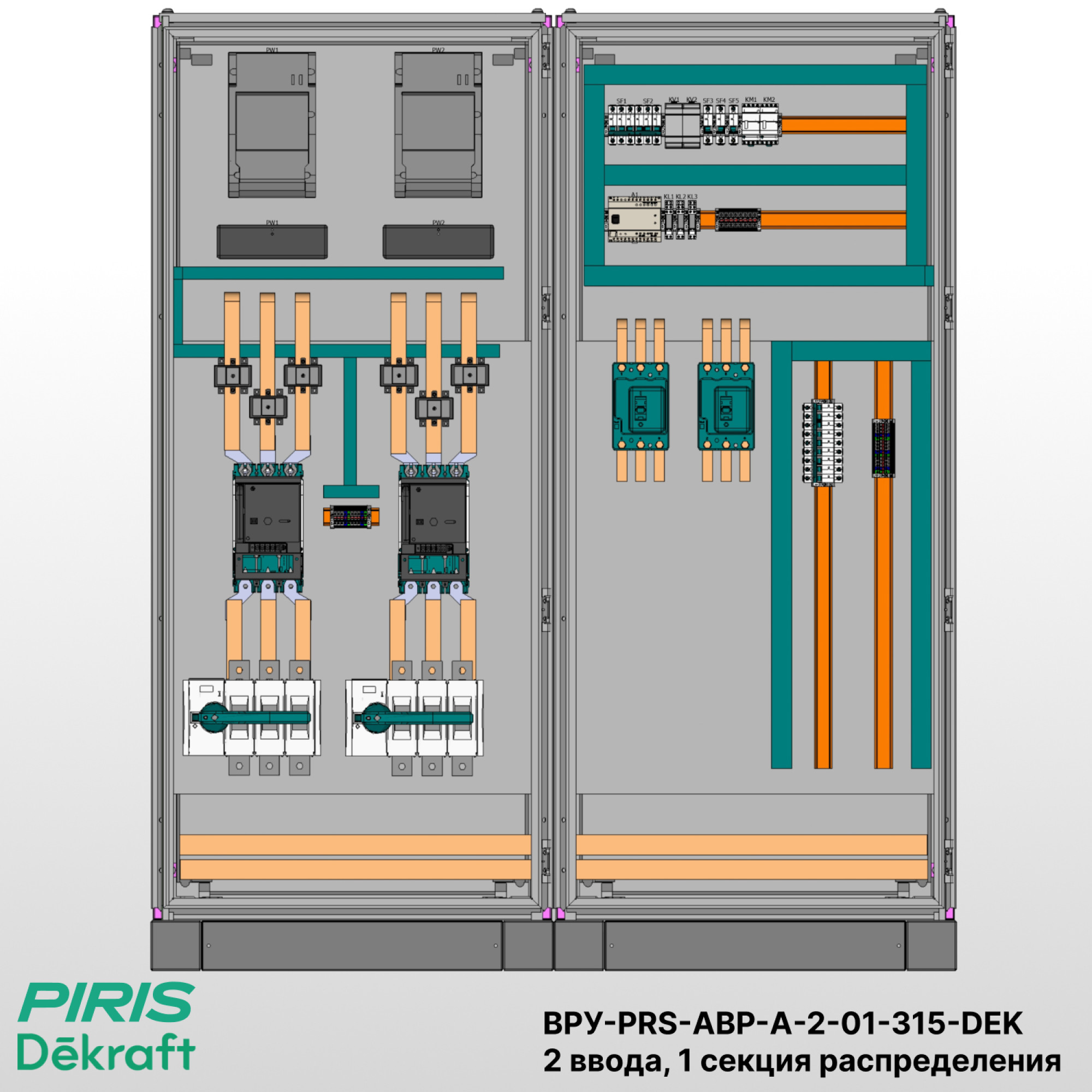 Вводно-распределительное устройство с АВР — ВРУ-PRS-АВР-А-2-01-315-DEK напольного исполнения, из цельносварного корпуса в габаритах 1800×1600×600 со степенью защиты IP31, предназначено для ввода и распределения питания силового оборудования 1-й категории электроприёмников, когда перерыв в электроснабжении недопустим.