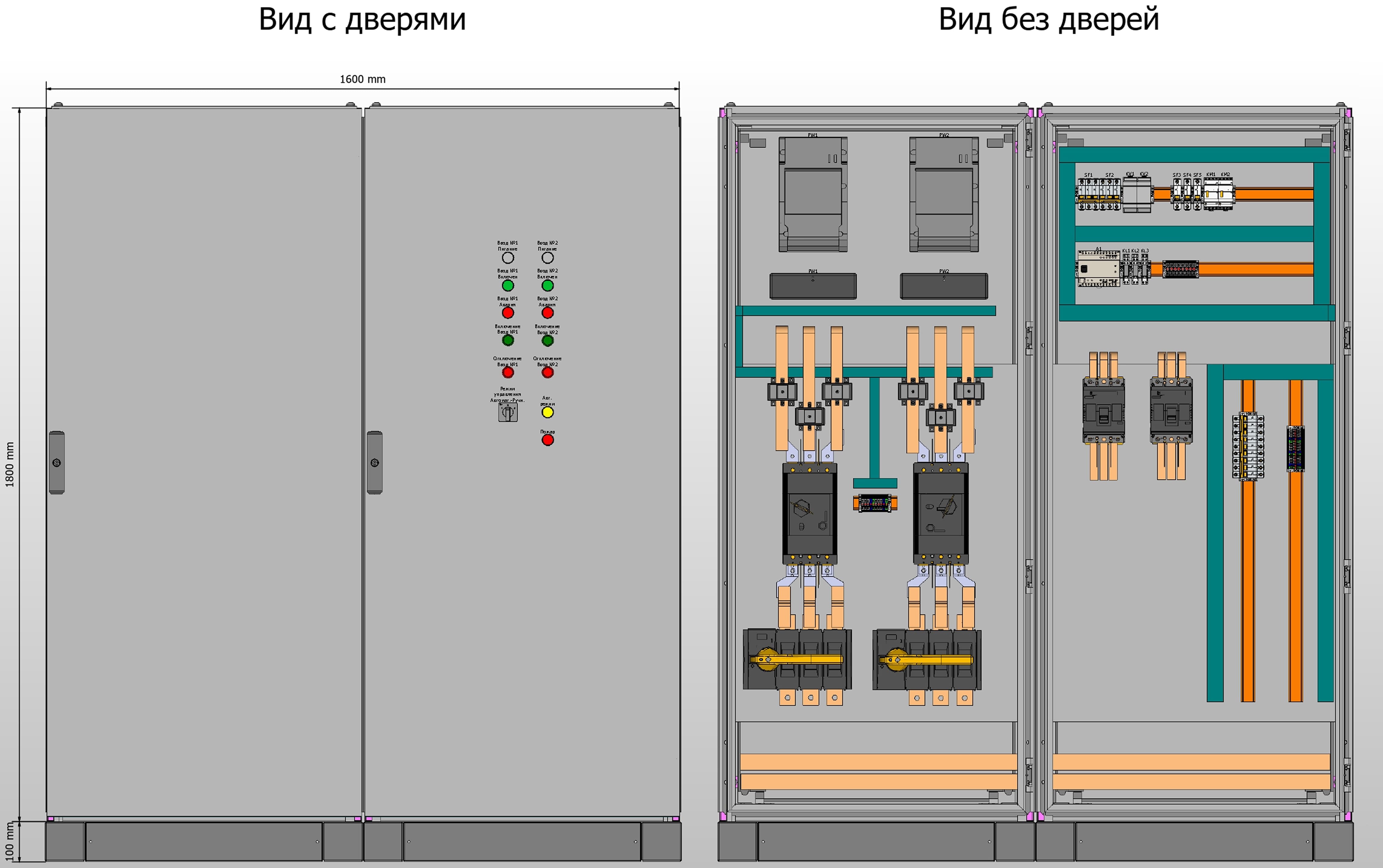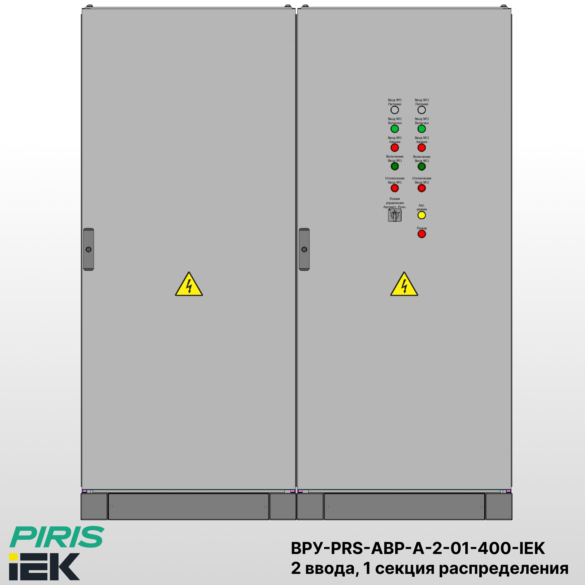 Вводно-распределительное устройство с АВР — ВРУ-PRS-АВР-А-2-01-400-IEK напольного исполнения, из цельносварного корпуса в габаритах 1800×1600×600 со степенью защиты IP31, предназначено для ввода и распределения питания силового оборудования 1-й категории электроприёмников, когда перерыв в электроснабжении недопустим.
