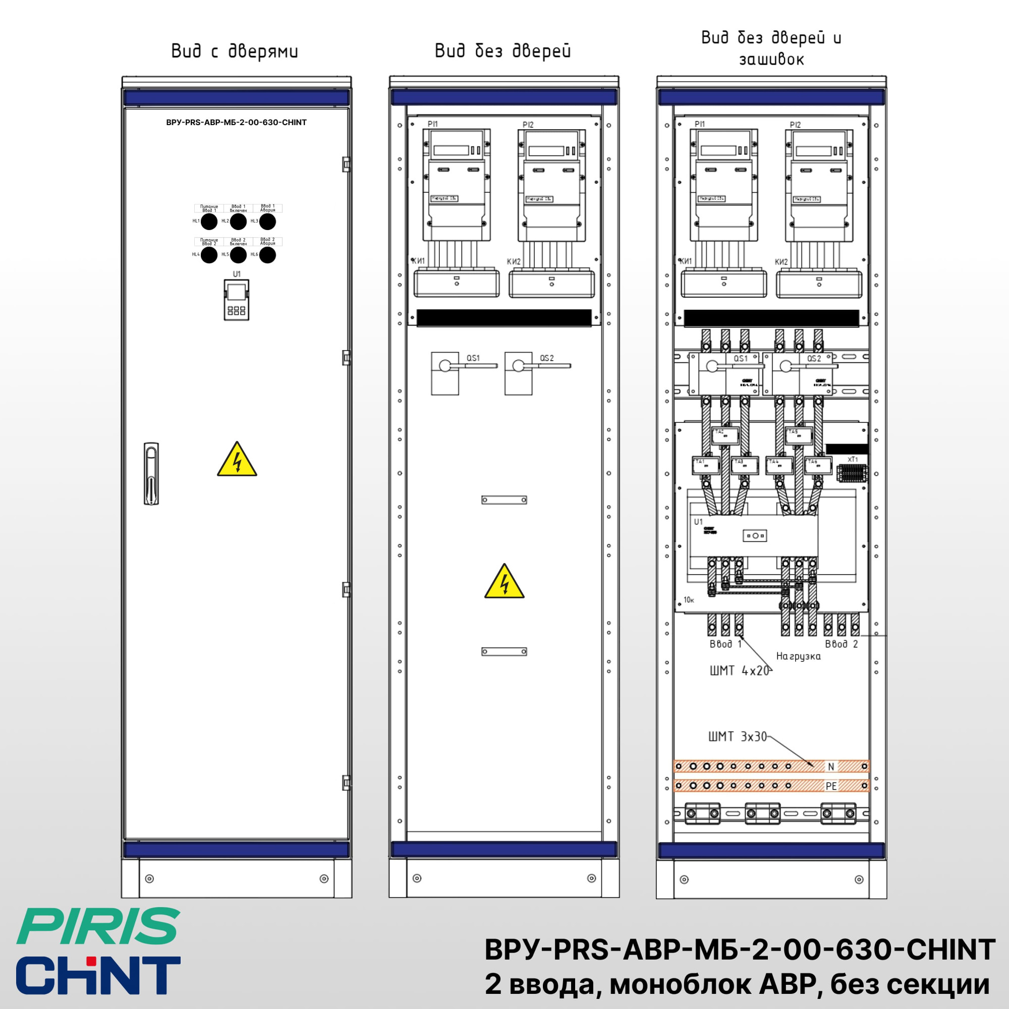 Вводно распределительное устройство ВРУ-PRS-АВР-МБ-2-00-630-CHINT на два ввода (рабочий и резервный), предназначен для приёма и распределения питания силового оборудования 1-й категории электроприёмников. Перерыв электроснабжения допускается только на время переключения с основного на резервный ввод. Шкаф применяется на жилых, промышленных и коммерческих объектах, где требуется высокая надёжность электроснабжения.