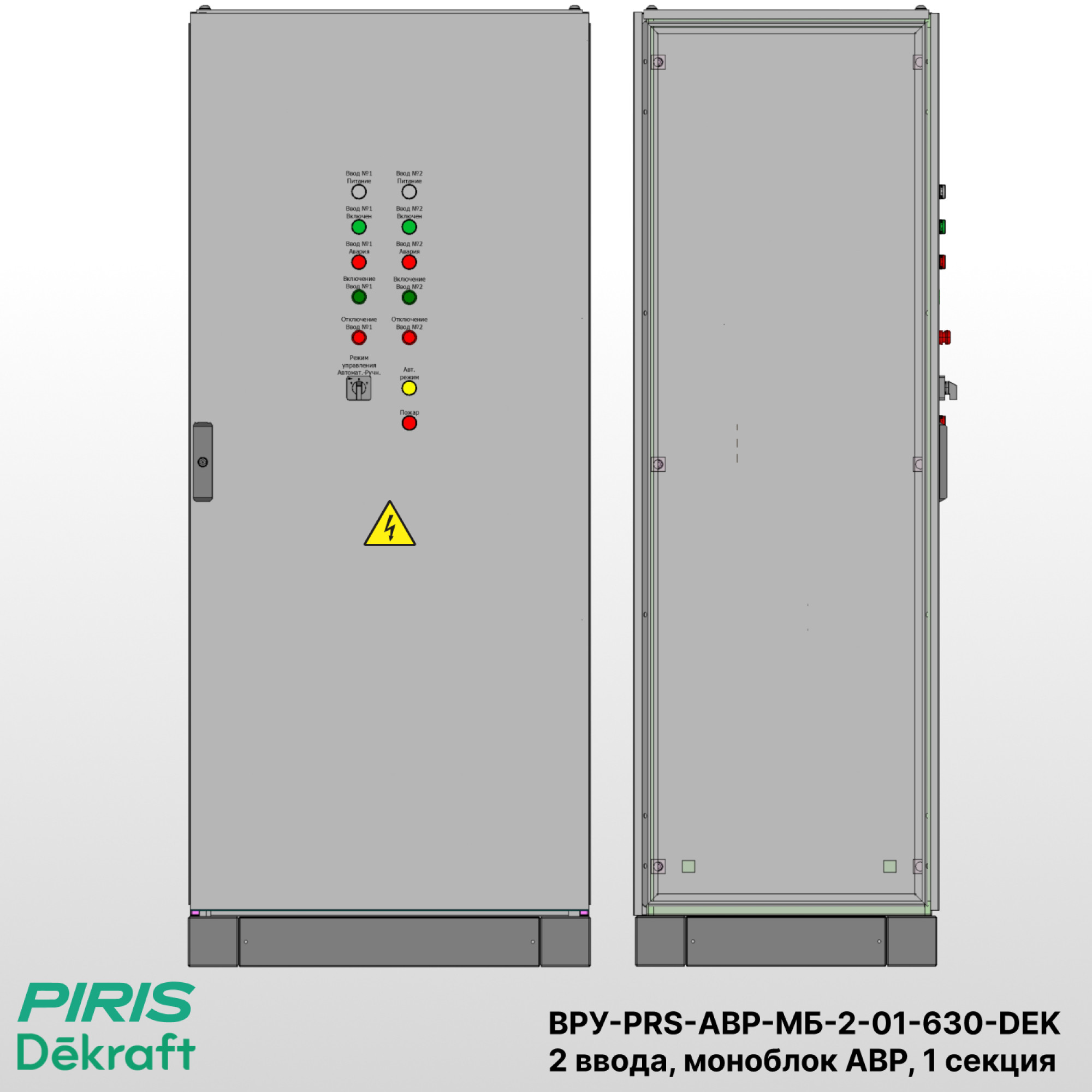 Вводно-распределительное устройство ВРУ-PRS-МБ-2-01-630-DEK на два ввода (рабочий и резервный), предназначено для приёма и распределения питания силового оборудования 1-й категории электроприёмников. Перерыв электроснабжения допускается только на время переключения с основного на резервный ввод. Шкаф применяется на жилых, промышленных и коммерческих объектах, где требуется высокая надёжность электроснабжения.